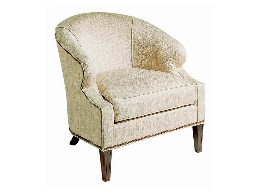 Product Description: Hickory Chair HC317-23 Upholstery Edward Chair - Circular styling characterizes the Edward chair. Burnished brass hobnailed and sloping shaped arms add dimension and character. The exposed wood legs create custom options. Standard with NS-00 nail trim. Spring-Down seat cushion standard. Medium Mahogany is the standard finish. Cream Lacquer paint and NS-03 nail head trim shown.