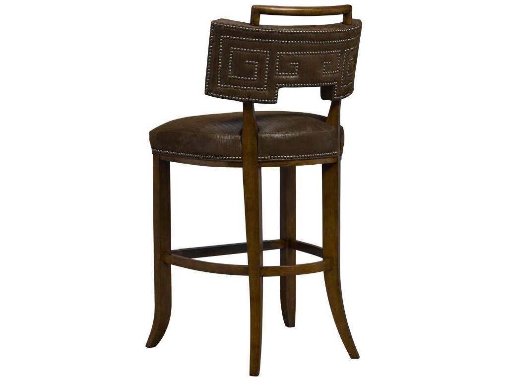 Product Description: Hickory Chair HC3409-04 Saint Giorgio Bar Stool With Handle - The Saint Giorgio Bar Stool is rich with detail. Beginning with the wooden pull across the back, paired with distinctive nailhead embellishments, it makes for a debonair dining choice. This stool comes standard with welt but is shown with optional NS-08 nails in a distinctive Greek key pattern. Truffle is the standard finish. Optional Tawny finish and NS-08 Old Brass nail head trim shown. Nail head trim available in small, petite and faceted nails only. Kickplate finish available in Antique Brass or Antique Nickel. Also available in counter height.