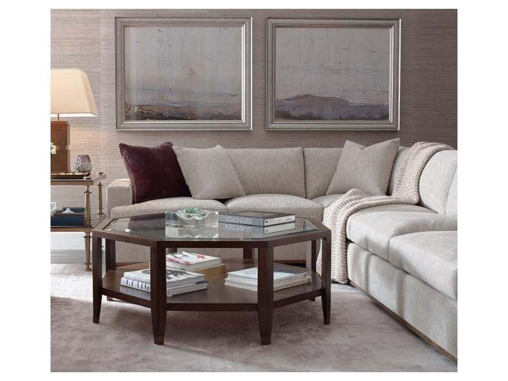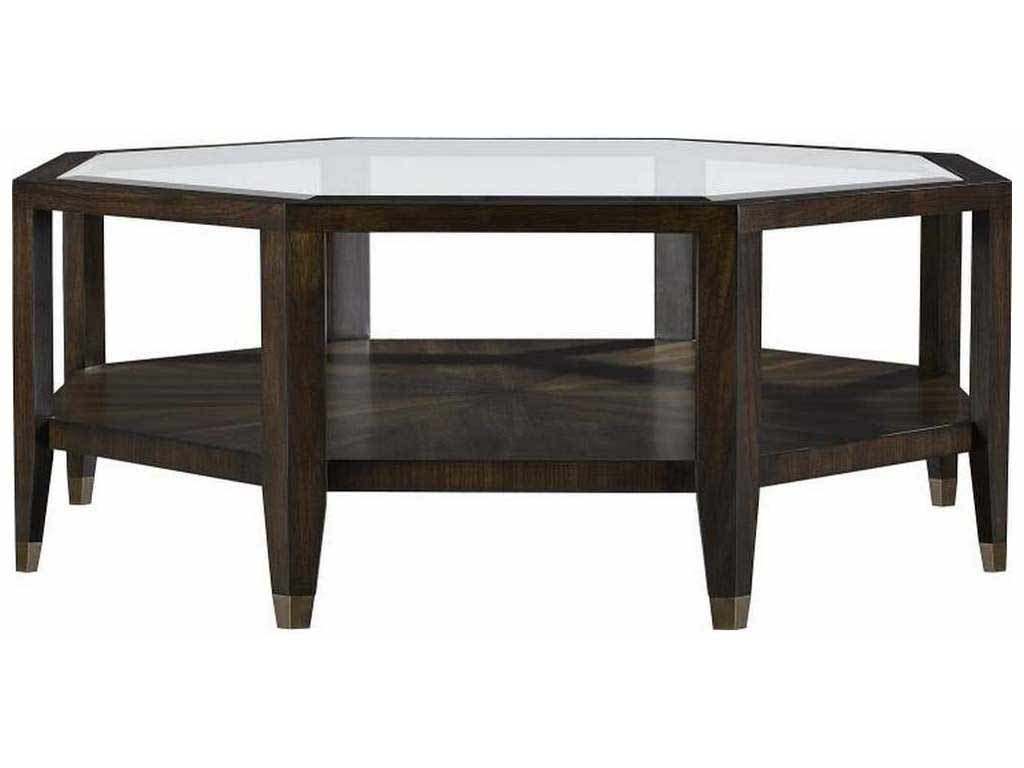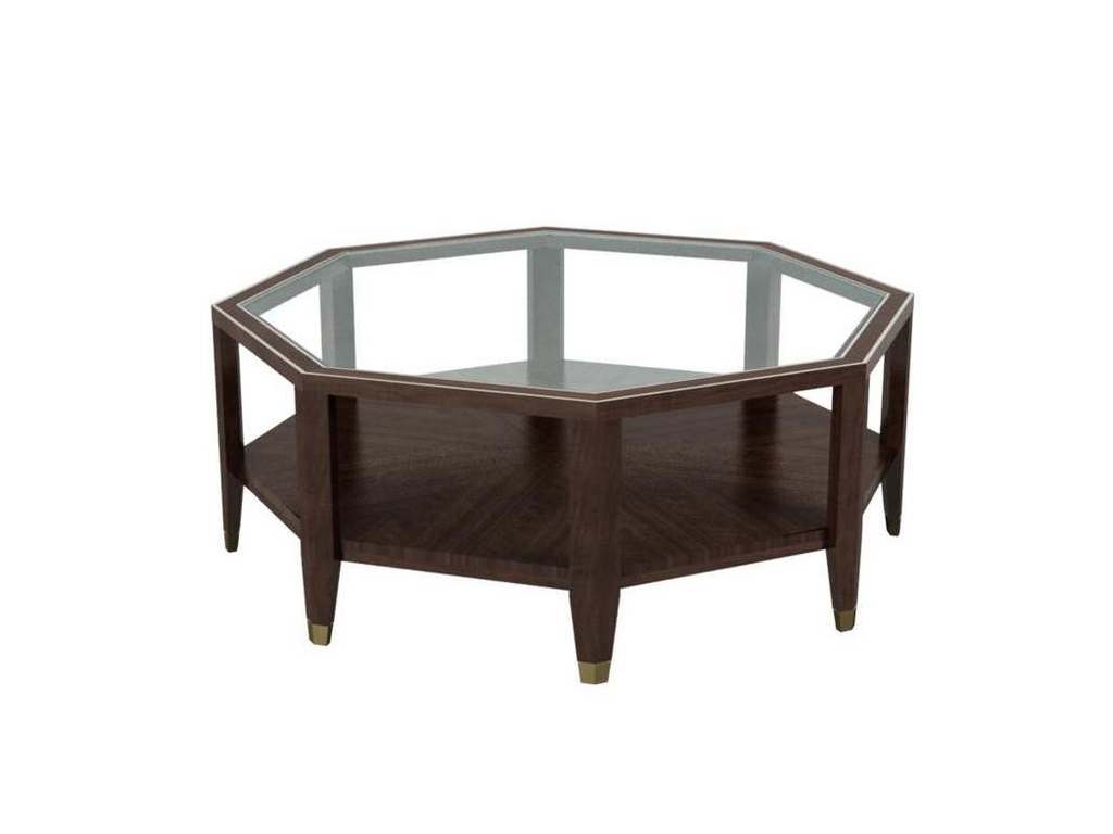 Product Description: Hickory Chair HC3479-70 Raffles Cocktail Table - With its striking octagonal shape and pure lines the Raffles Cocktail Table exhibits David Phoenix's attention to thoughtful detail and adds a touch of modernity to any space. Crafted from fine American Walnut, a beveled clear glass top, and beautiful radial cut American Walnut veneer adorns the bottom shelf and lastly, each post is hand-fitted with Aged Brass ferrules, This beautiful cocktail table combines form and function. Clear beveled glass top and Aged Brass ferrules standard. Truffle is the standard finish.