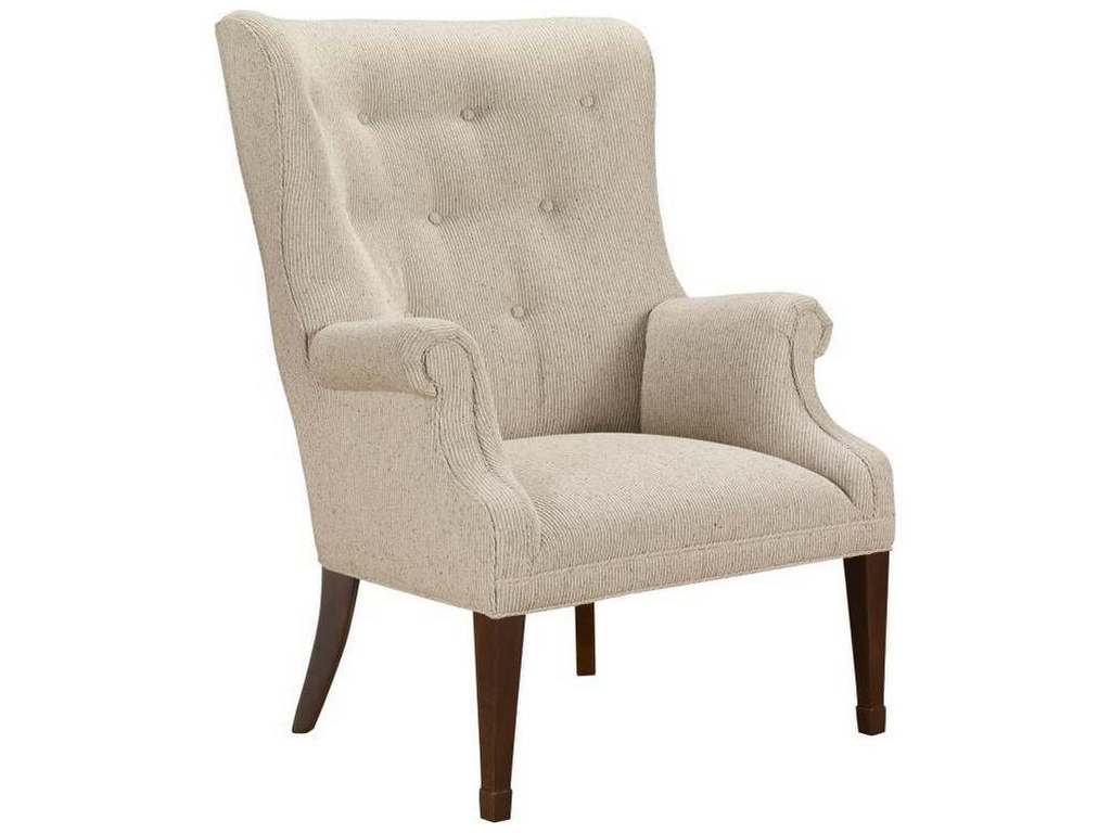 Product Description: Hickory Chair HC382-55 Isaac Wing Chair - The Issac Wing Chair has a graceful form that is accentuated by its slender tapered legs and barrel-shaped buttoned back. Medium Mahogany is the standard finish. Spring-Down seat cushion standard. Dark Walnut finish shown without standard NS-00 nail head trim.