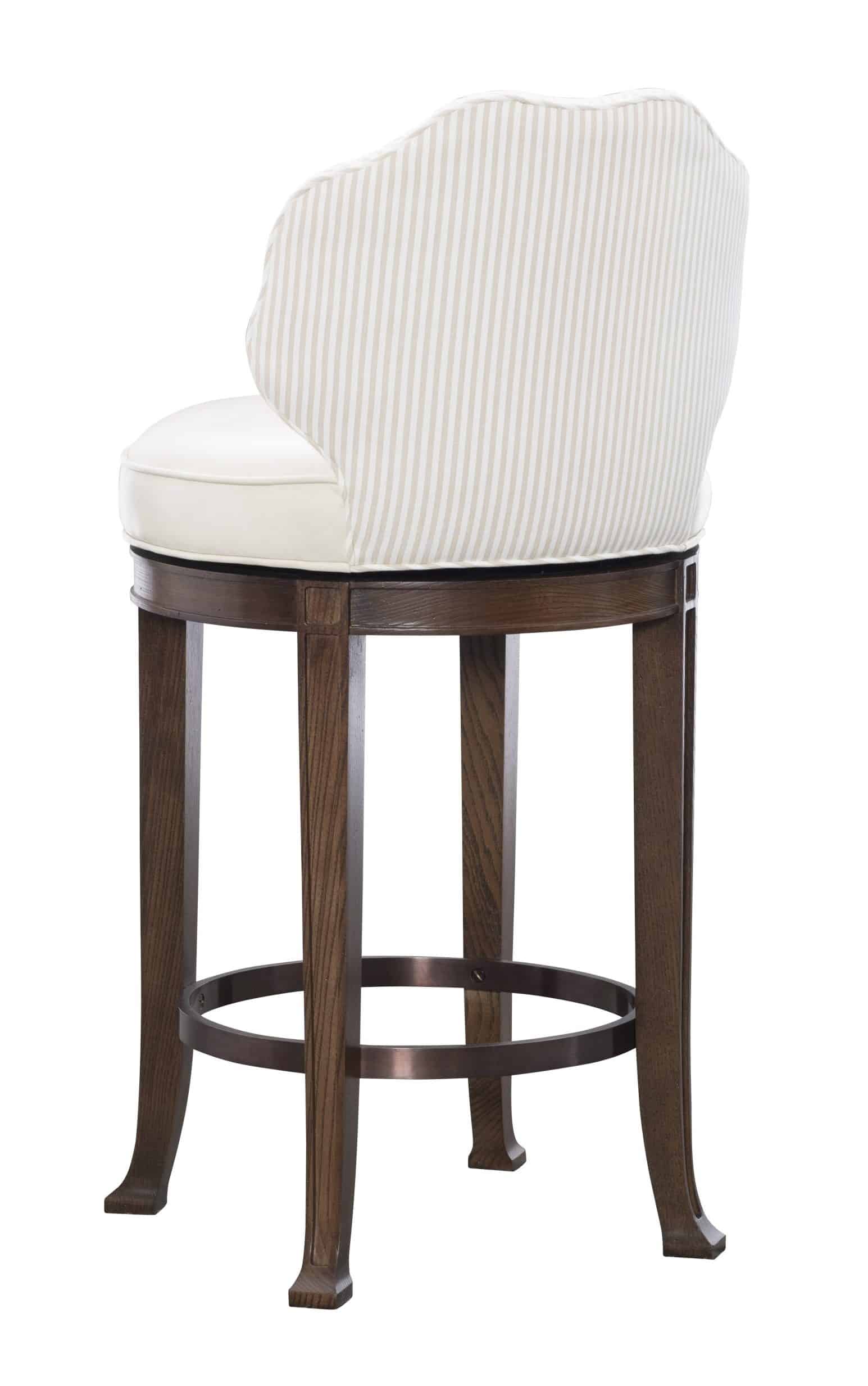 Product Description: Hickory Chair HC6710-03 Salomone Swivel Counter Stool - Salamone Swivel Stools by Kim Scodro — Distinguished by their sculptural presence, the Salamone Swivel Stools feature a tapered, flared base crafted from solid ash with subtle carved detailing. A circular metal footrest, available in antique silver, brass, or bronze, provides both function and refinement. Optional small or petite nails only. The defining element is the gracefully scalloped back profile, outlined with a single welt that accentuates its unique silhouette. A perfect blend of craftsmanship and character, Salamone brings elegance to any setting.