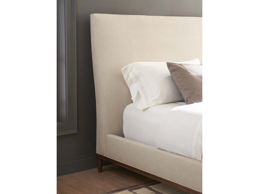 Product Description: Hickory Chair HC7255-10 Emile King Bed - "The Emile Bed gathers its strength of design in quiet ways," Booth says. "The sinuous curve of the back, the American Walnut wood details and tapered legs are all subtle, but together create an elegant form that's also a very comfortable place to rest your head every night." Outback of headboard fully upholstered to allow the bed to float. Weltless except around the base. Truffle is the standard finish.