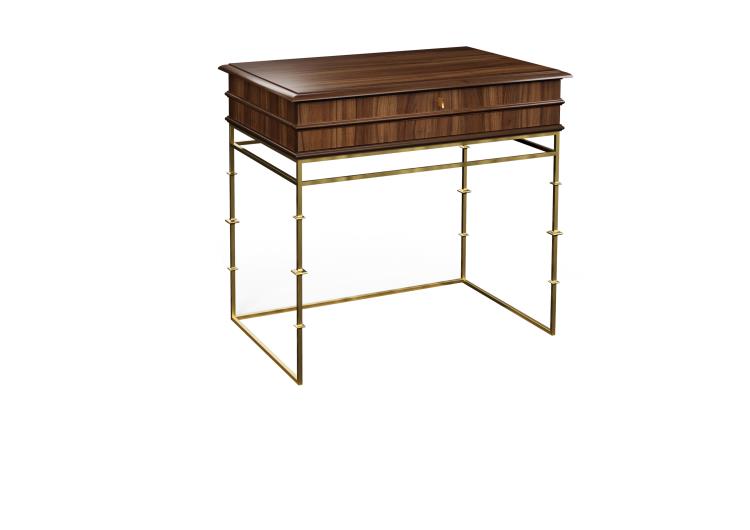 Product Description: Hickory Chair HC766-70 Hamlin 1 Drawer Nightstand - The Hamlin 1-Drawer Nightstand blends modern form with historical influence, featuring a single drawer adorned with horizontal solid walnut moldings that subtly reinterpret North African design elements in Spanish cabinetry. Crafted from American walnut solids and veneers, its broad silhouette is elevated on metal base with knuckle details, the base is offered and three finishes—Antique Bronze, Antique Silver, Antique Brass . A faux escutcheon is standard in coordinating finish. Customization is effortless, with no upcharge for selecting one of the three finish. Standard with soft-close Blum glides on the single drawer. The opening is specifically scaled to fit the PE6517-50 Masie Ottoman or any ottoman smaller than 25” W x 18.5” H x 17” D (to fully nest underneath).