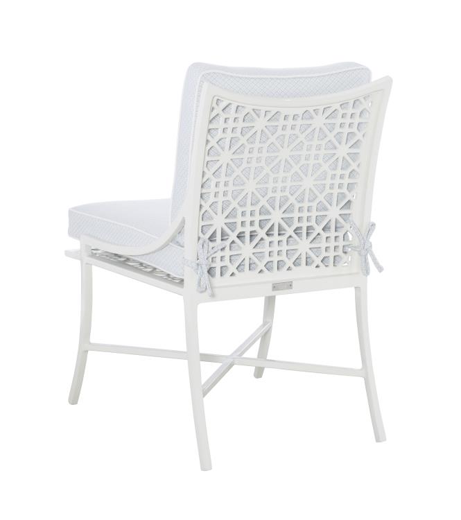 Product Description: Hickory Chair HCD8900-02-W Haret Dining Chair Cloud White - The Haret series is an elegant metal outdoor collection with a distinctive signature fretwork on the seat and back and with lyrical lines of the arms, legs and top rails of the upholstered pieces. The Haret Outdoor Dining Chair is standard with a DryTech seat and back cushion. Available in two finishes: Cloud White or Smoke Grey. The back cushion is secured with two ties in the bottom corners. A custom fitted outdoor protective cover is sold separately as HCD8900-02-PC.