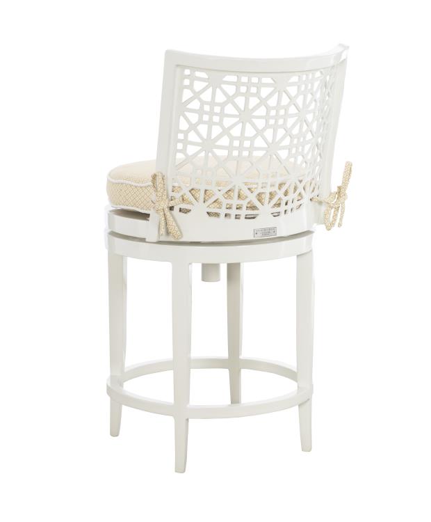 Product Description: Hickory Chair HCD8900-03-W Haret Counter Stool Cloud White - The Haret Counter Stool is an elegant metal outdoor seating option, featuring the collection’s distinctive signature fretwork on the back. The gracefully concave backrest gently hugs and supports for added comfort. Each counter stool comes standard with a DryTech seat cushion, secured to the fretwork back with a tie for a tailored look. Available in two finishes: Cloud White and Smoke Grey. A custom-fitted outdoor protective cover is sold separately (HCD8900-03-PC).