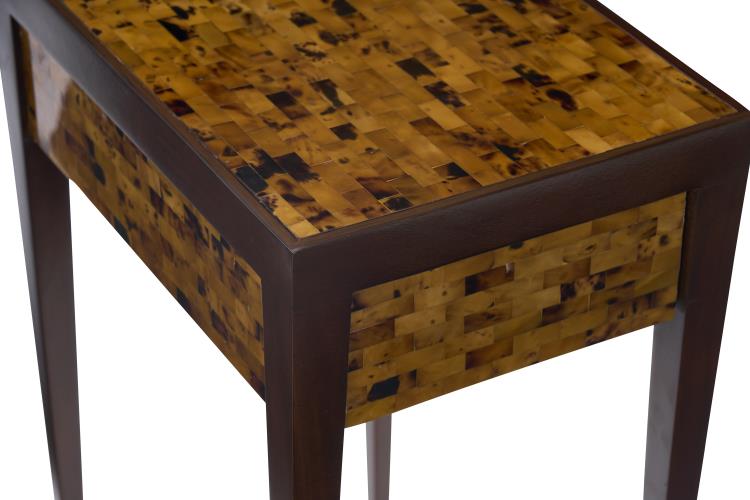 Product Description: Hickory Chair HCP286-STK Rufty Side Table - Finish: Truffle with Young Tiger Pen Shell clad top, sides, and drawer. Available as shown only.
