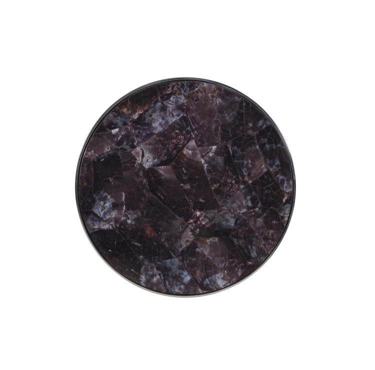 Product Description: Hickory Chair HCP299-STK Violet Spot Table - True to its name, the Violet Spot Table features a stunning violet oyster shell inlay on both the top and base, anchored by a polished stainless steel post. Perfect for those seeking a subtle touch of purple or a moody accent, this petite table makes a refined statement in any space.