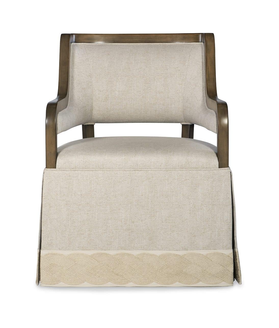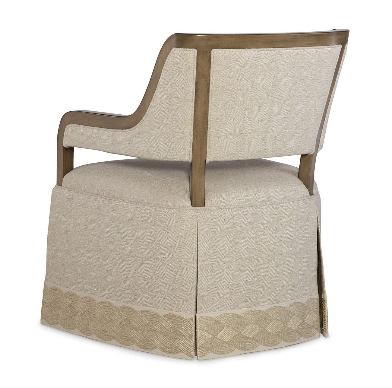 Product Description: Jessica Charles 1203SK-C Merritt Skirted Dining Chair With Casters - This elegant chair features sculpted wooden arms and a refined silhouette that blends structure with softness. Its tailored skirt is accented with an intricate woven trim, adding a touch of craftsmanship and sophistication to the overall design. Casters beneath the skirt allow for easy mobility.