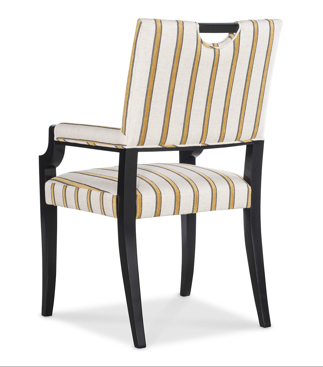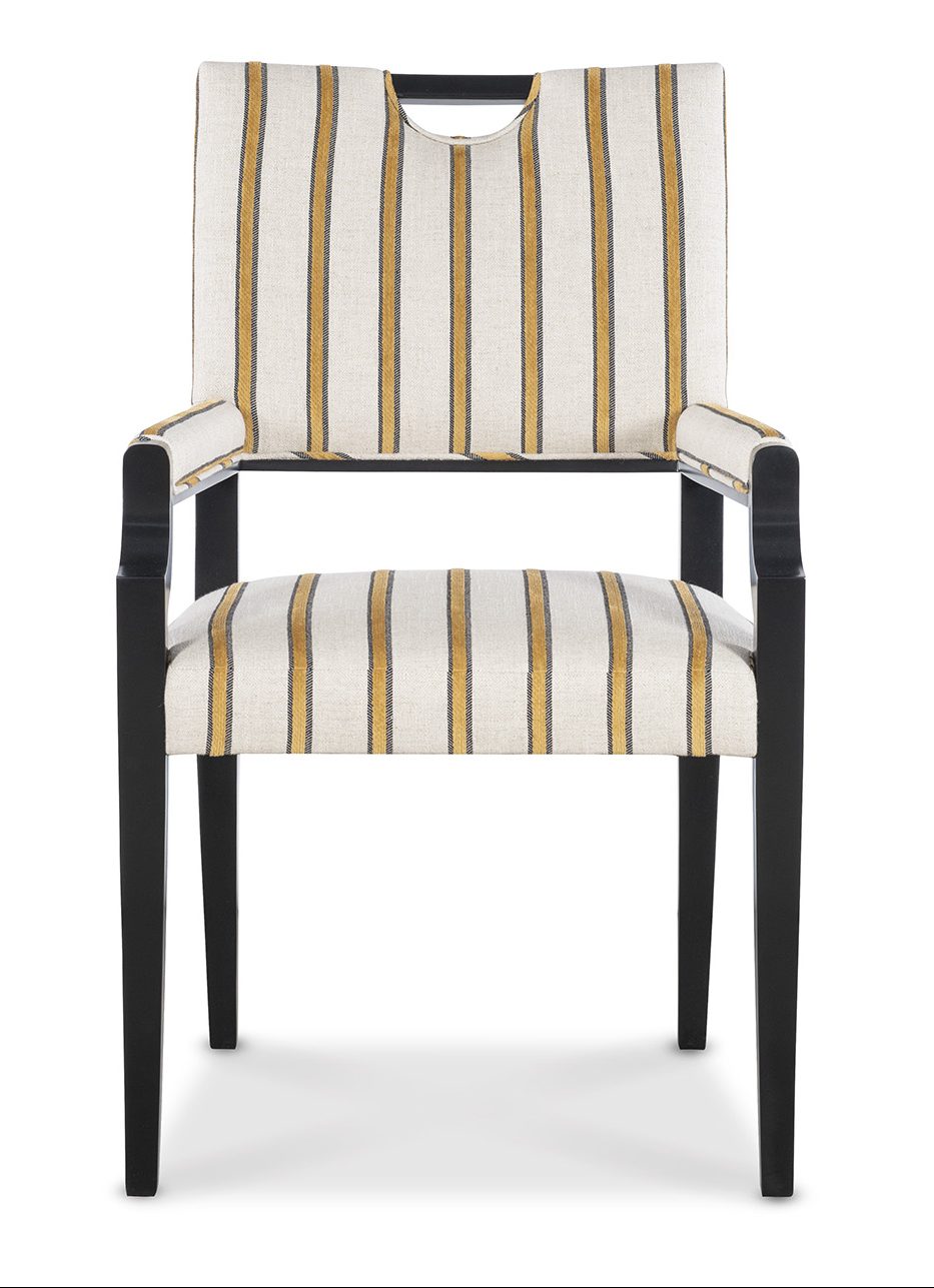 Product Description: Jessica Charles 1208-A Milena Arm Dining Chair - Simple styled dining chair with slightly arched back and wood exposed handle for ease of pulling away from table.Photographed in Paley Gilded with Ebony finish.