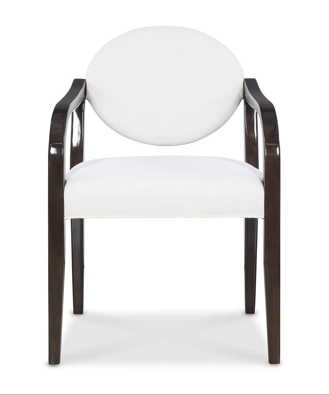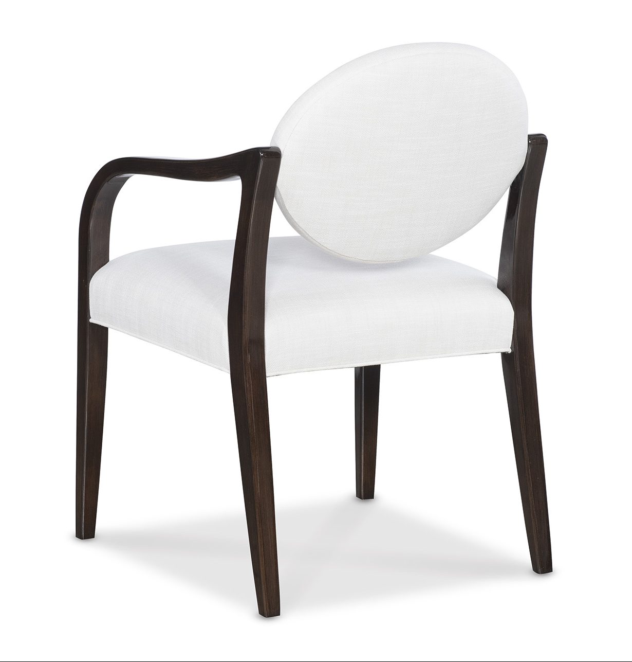 Product Description: Jessica Charles 1209-A Nicole Arm Dining Chair - Oval shaped back freely suspended by exposed wood frame creates an elegant and modern feel to this dining chair. Photographed in Rollo Linen with Umbria finish.