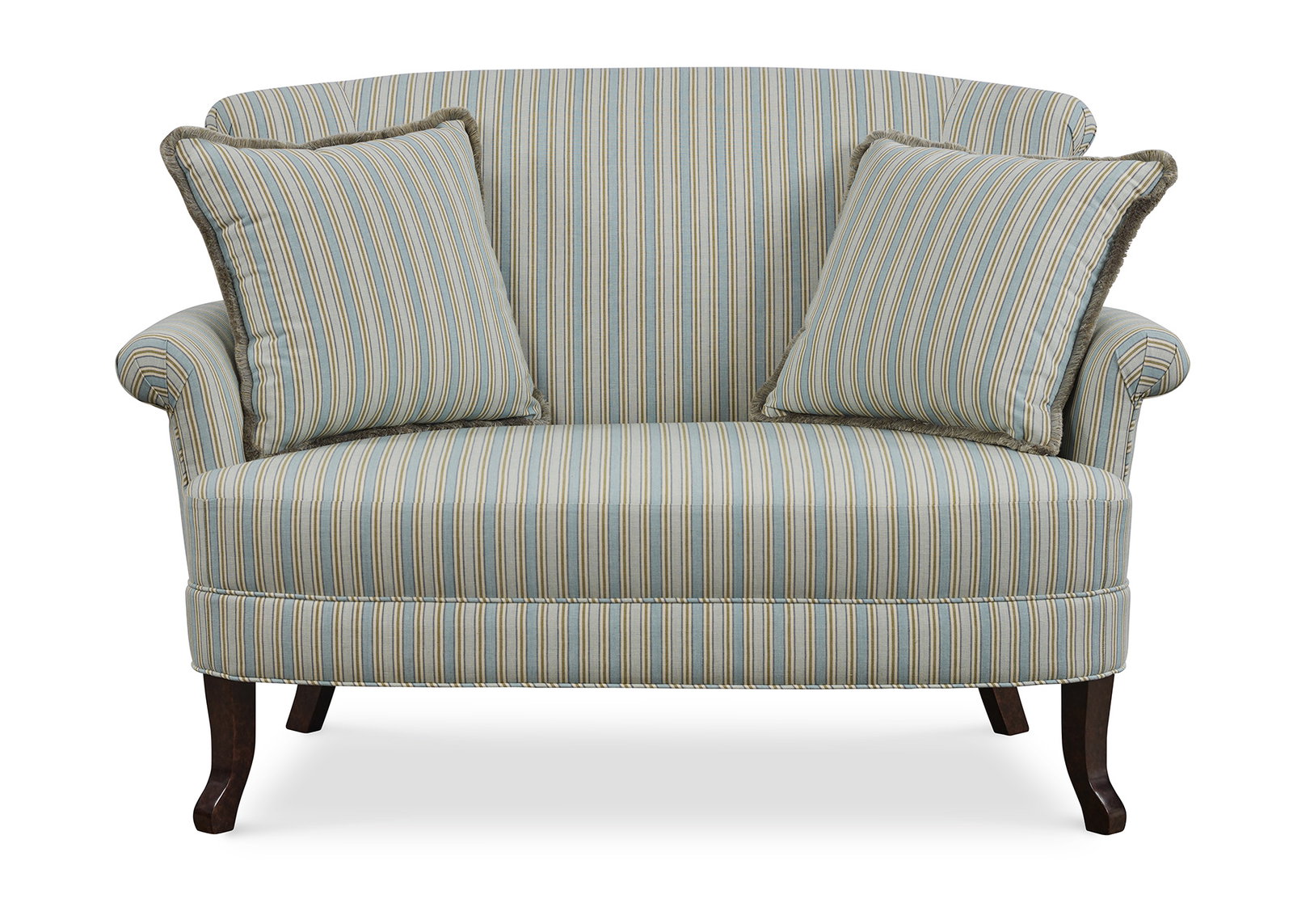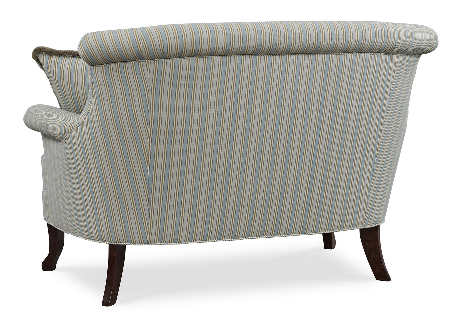Product Description: Jessica Charles 1762 Fitzroy Settee - Photographed in Stillwater Blue Tint with Bramble finish. Standard with two throw pillows shown in Stillwater Blue Tint with Pierre Silver Fringe.