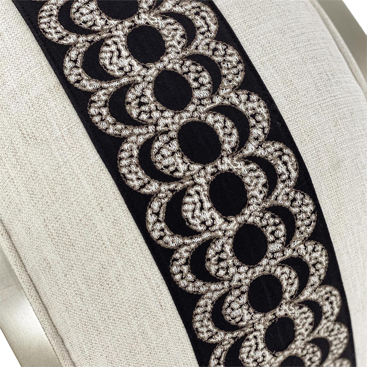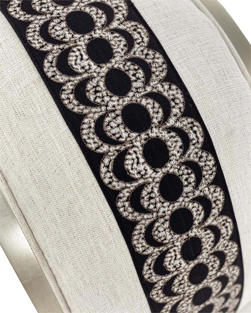 Product Description: John Richard AMF-1344-1109-AS Aintree Curved Bench - This Aintree Curved Bench is in a pewter silver finish and upholstered in a neutral fabric with a center stripe the length of the bench.