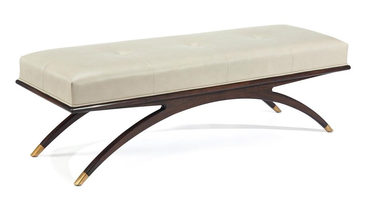 Product Description: John Richard AMF-1539V50-LTGY-AS Euclidean Bench - A single span arch supports the seat frame upholstered in a two-tone light grey leather. The frame is finished in Jupiter Walnut with the faux sabots in gold.