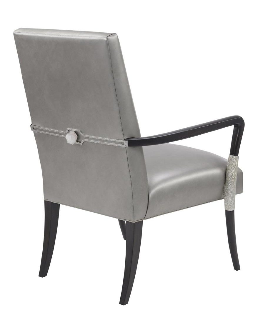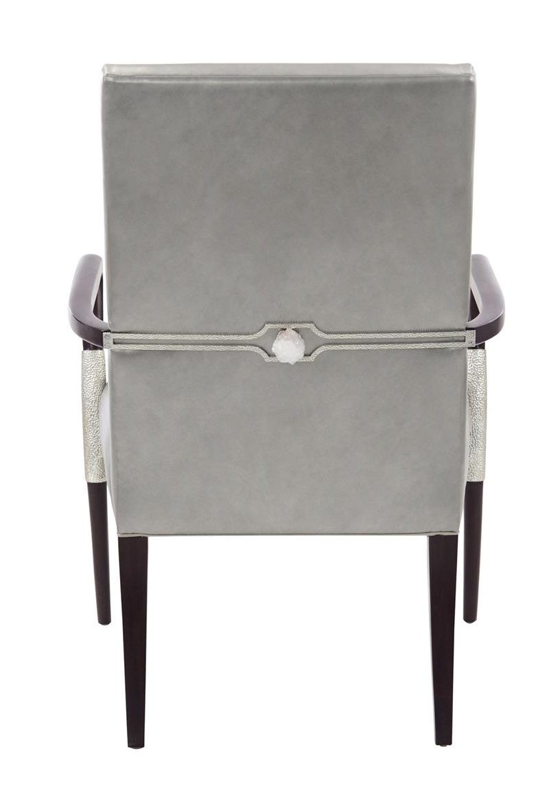 Product Description: John Richard AMF-1637V228S-ACPW Savona Armchair- ACPW - Savona armchair shown in V228S Sorano Brown (with Silver) finish and Anthem Casablanca Pewter leather. This armchair has a solid wood frame in sorano brown with carved decoration on the legs in silver leaf. The upholstered seat and back are in a soft-hand, metallic pewter leather, with a decorative polished nickel band to the rear finished with a white crystal geode