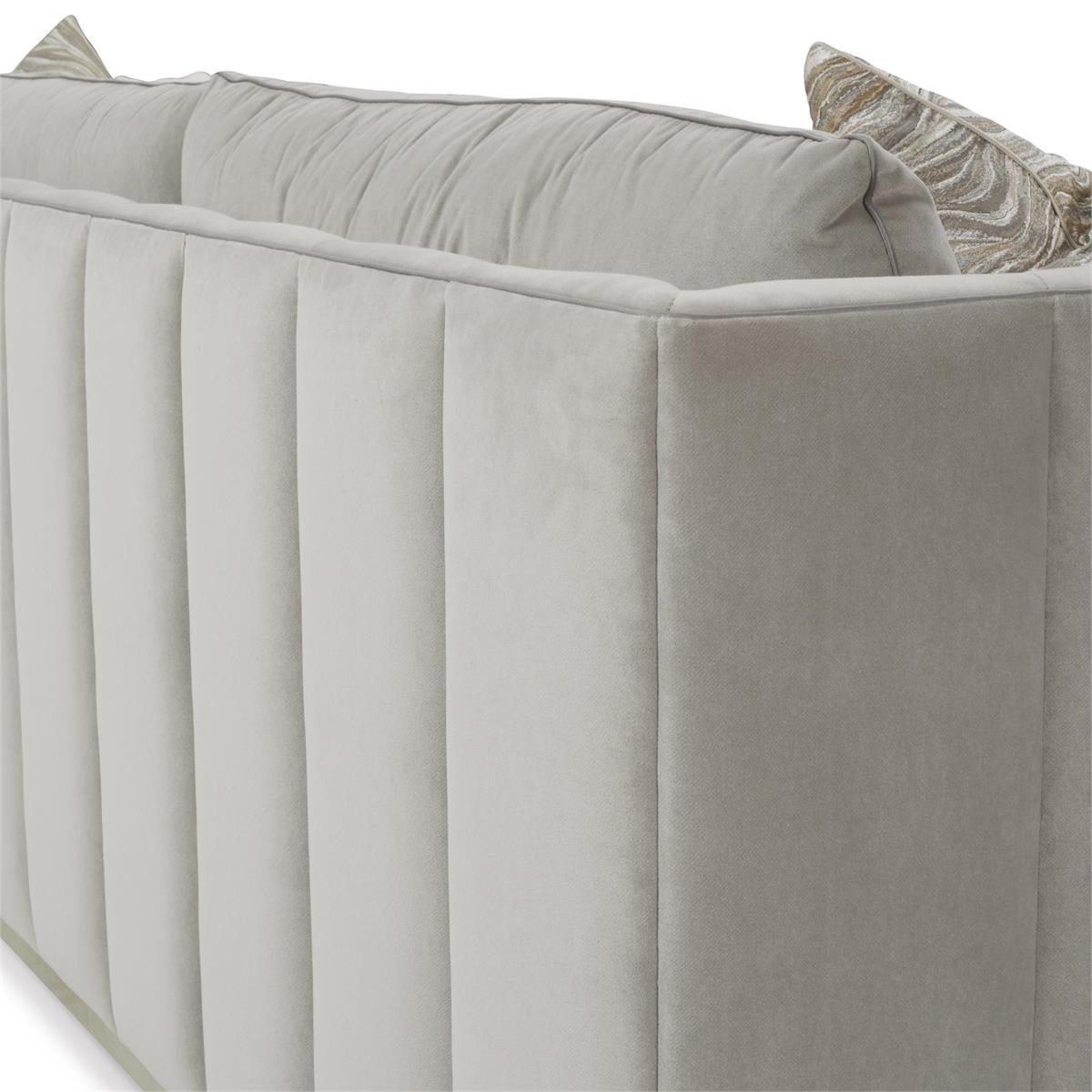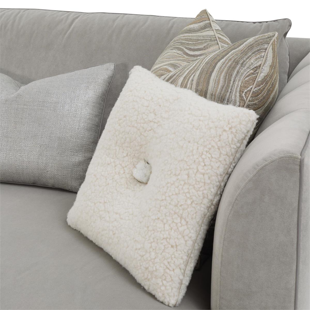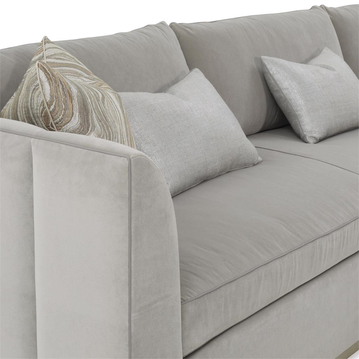 Product Description: John Richard AMF-1684V226-2223-AS Paris Chaise Sectional R-Sofa - The Paris Chaise Sectional displays a plinth base of beech wood in a burnished silver finish, paired with upholstered channel detailing along the inside and outside of the back. The piece is shown in gorgeous Sintra Stone 2223 fabric, accented with several configurable pillows and small welt trim in Gimlet Platinum 1115 along the frame. The sectional features a chaise extension as well as six throw pillows in a variety of fabrics, one with a quartz crystal.