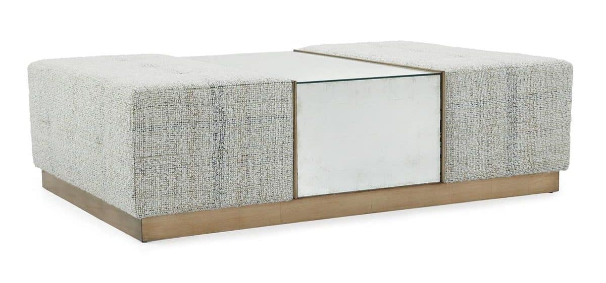 Product Description: John Richard AMF-1781V229-4071-AS Park City Cocktail Ottoman - The Park City Cocktail Ottoman is a seamless marriage of utility and lavish style. Crafted from beech wood, the piece showcases leather upholstery in Riggs Mineral 4071 fabric, accented with trim in Gimlet String 1120. A plinth base in an opulent Valyrian Gold finish, serving as a wonderful highlight to the églomisé tabletop.