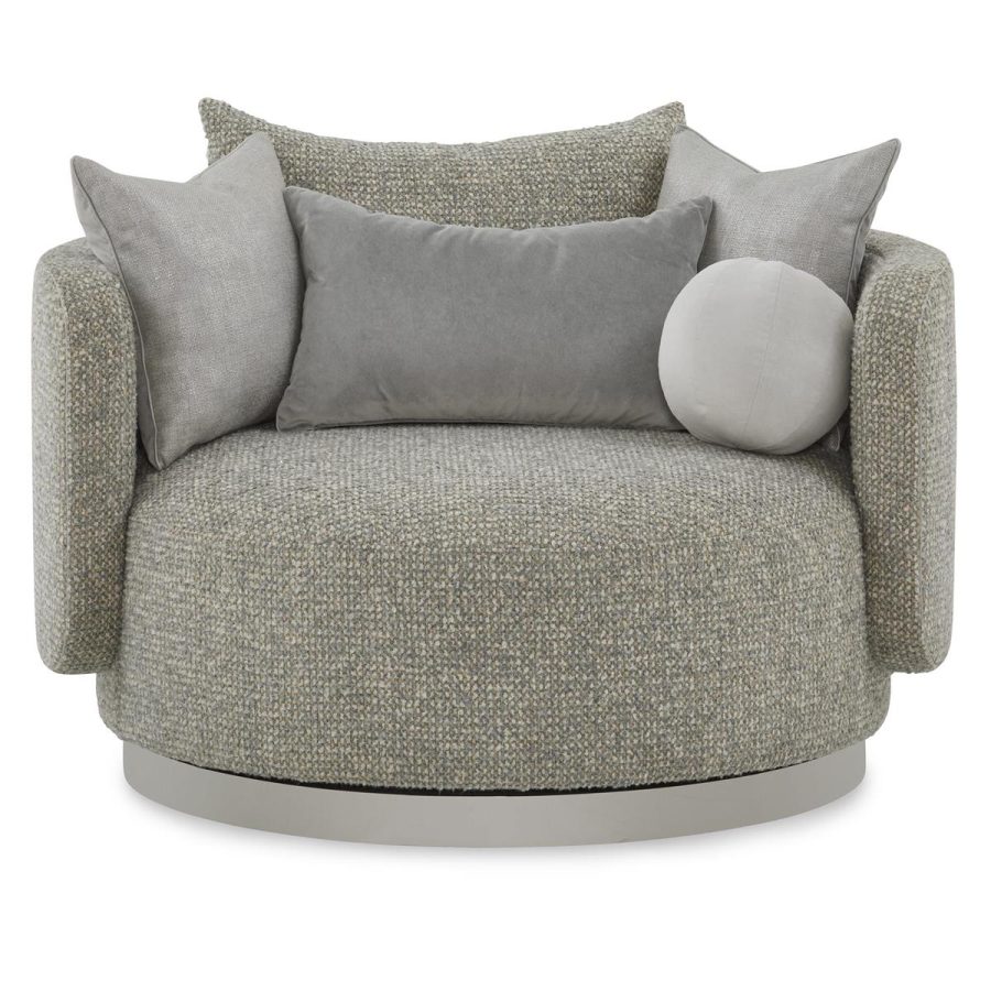 Product Description: John Richard AMF-1789-5019-AS Soledad Swivel Lounger - The Soledad Swivel Lounger is a gorgeous contemporary seating solution that imbues a space with lavish tones and sleek curvature. Showcasing a stunning rounded profile, this swivel lounge chair is upholstered in Poplin Granite 5019 fabric, with welt trim in Noble Platino 2156. A rounded, stainless-steel base with a polished finish tastefully complements the neutral tones of the upholstery, completing the look. The piece comes with five throw pillows of varying shapes and sizes.