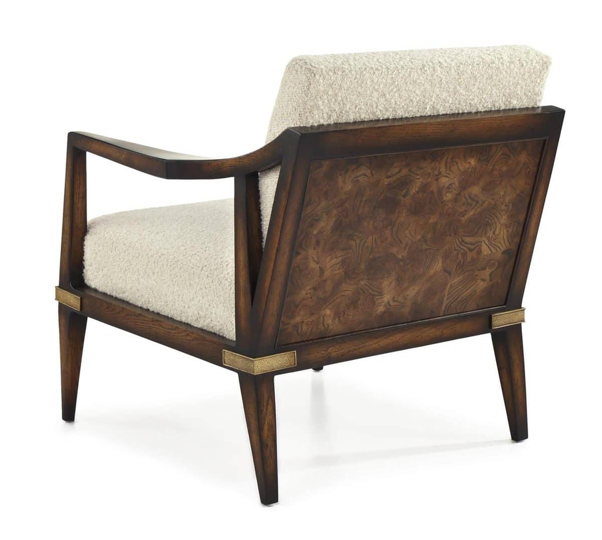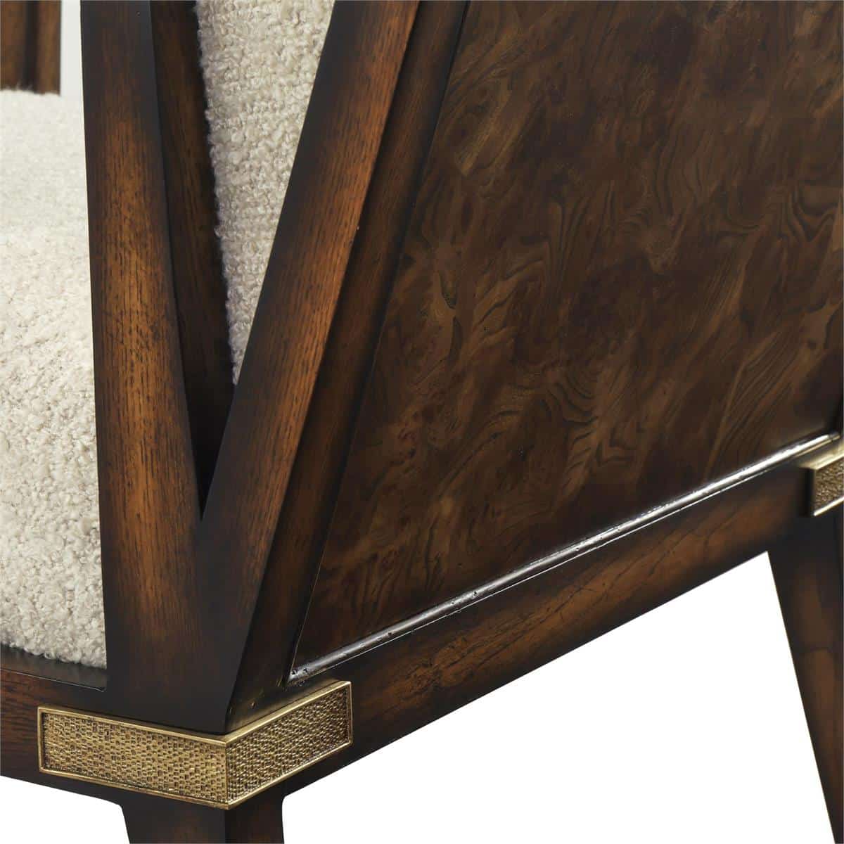 Product Description: John Richard AMF-1814V18-3043 Pointe Armchair - The Pointe Armchair is a contemporary reinterpretation of a classic design. Its exposed mahogany frame, finished in a rich Sable hue, highlights the wood's natural beauty. The exterior side of the back showcases Elm Burl, offering a striking contrast to the straight grain of the mahogany. Subtle Antique Brass accents add depth and a hint of opulence, while the elegantly curved armrests enhance the chair's refined silhouette. Upholstered in Revival Parchment 3043 fabric, showcasing a stylish cream tone, the piece embodies timeless sophistication.