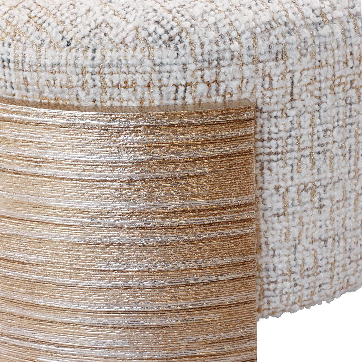 Product Description: John Richard AMF-1852V229B-4071 Certa Bench, Striated - The Certa Bench brings sculptural flair to any space with its graceful curves and thoughtful detailing. The ovate seat is upholstered in Riggs Mineral 4071, resting atop two beech wood legs finished in Striated Valyrian Gold. Each leg wraps around the edges of the bench in a curved silhouette, defined by dimensional lines that lend depth and distinction to the design.