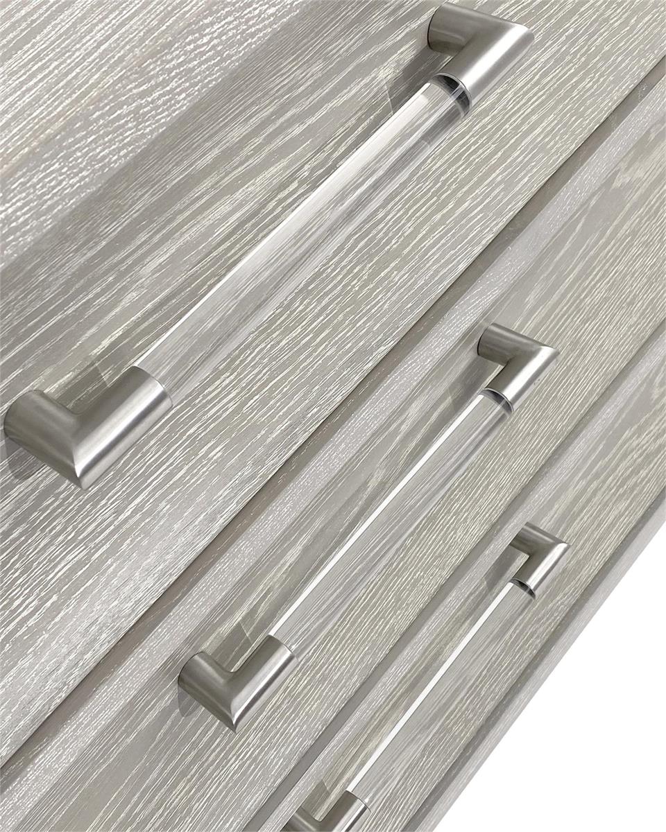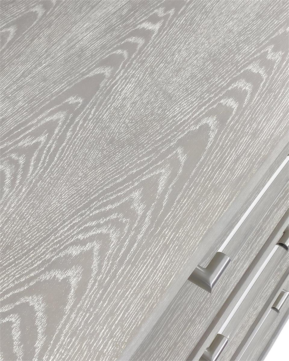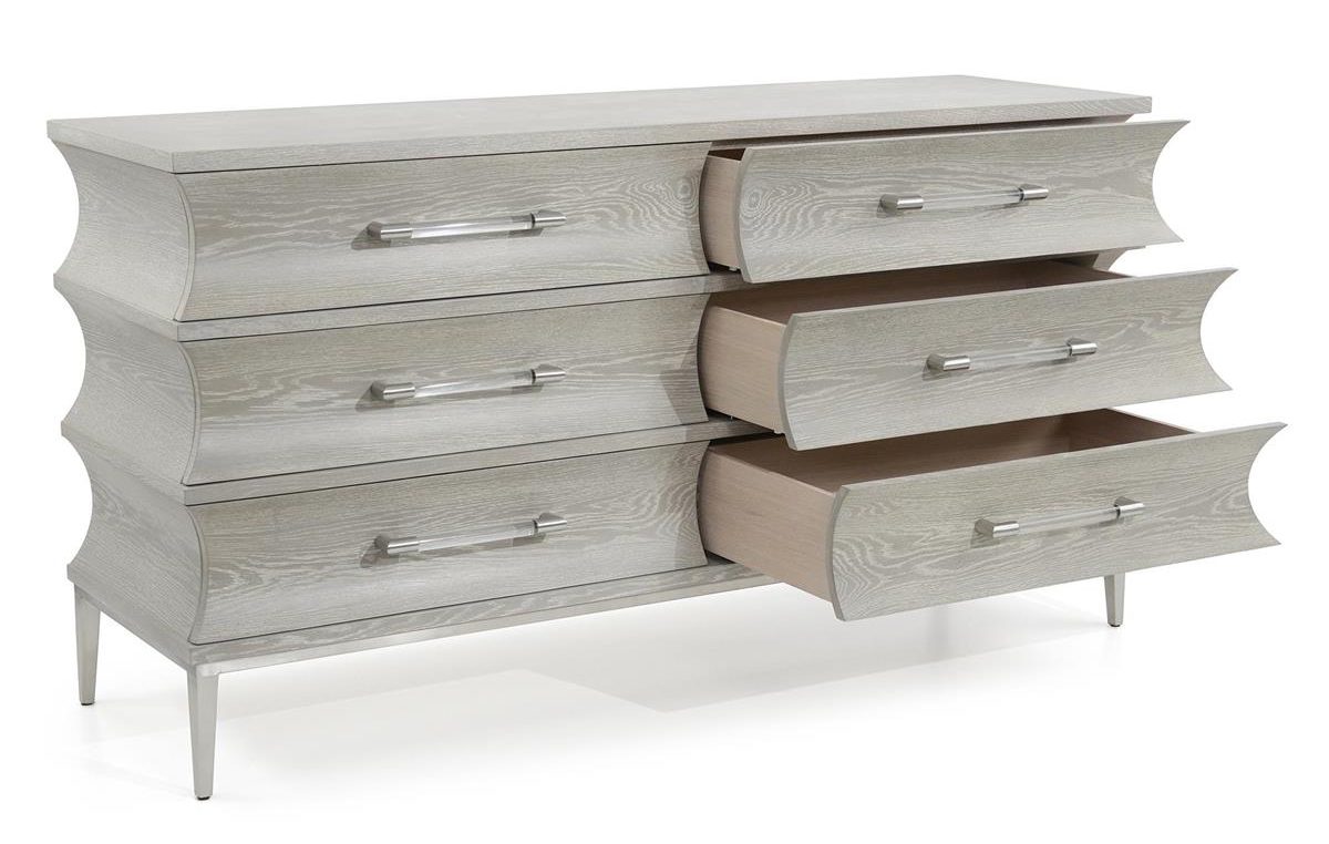 Product Description: John Richard EUR-01-0396 Granchio Six Drawer Chest - Fully encased in sandblasted grey oak, this six-drawer chest replicates elegant, curved features. Each drawer features elongated handles of stainless steel and acrylic.