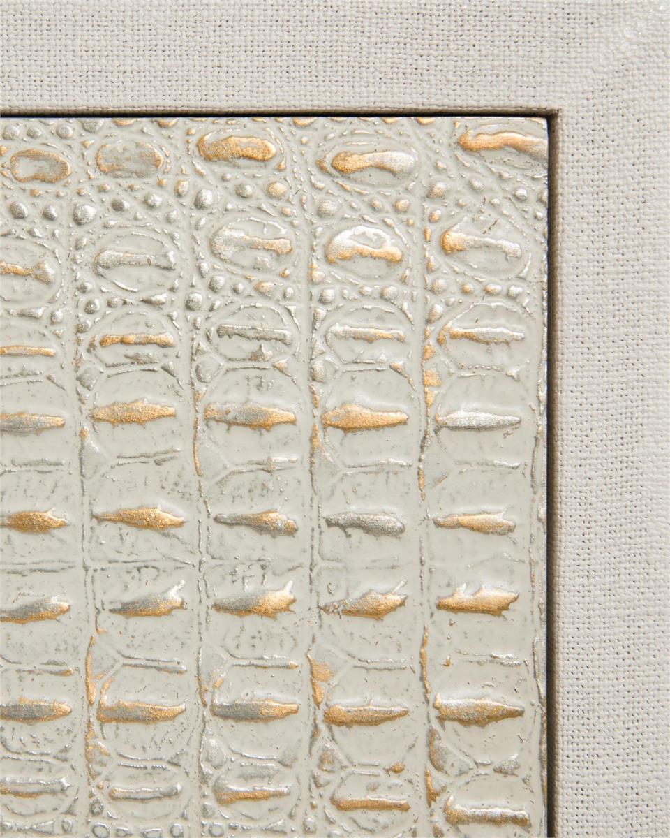 Product Description: John Richard EUR-01-0397 Kano Nine Drawer Sideboard - Encased in a washed linen finish, this sideboard features a faux crocodile pattern across each drawer in a variegated white and cream finish with gold highlights, with brushed gold hardware. The case sits on decorative metal stands in Aztec gold.