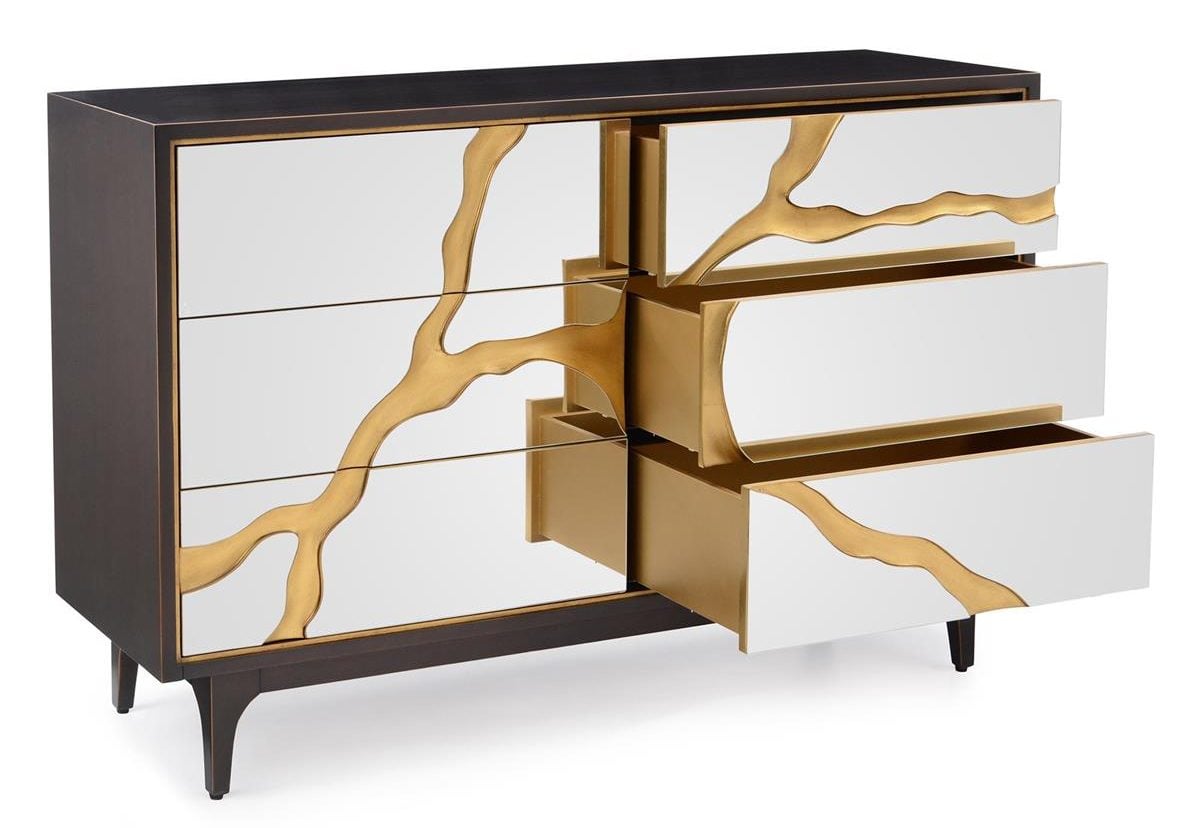 Product Description: John Richard EUR-01-0419 Ravine Six Drawer Chest of Drawers - This six-drawer chest features modern beveled mirror fronts with an inset ravine pattern in a gold finish. The cabinet and base are finished in smoked oak.