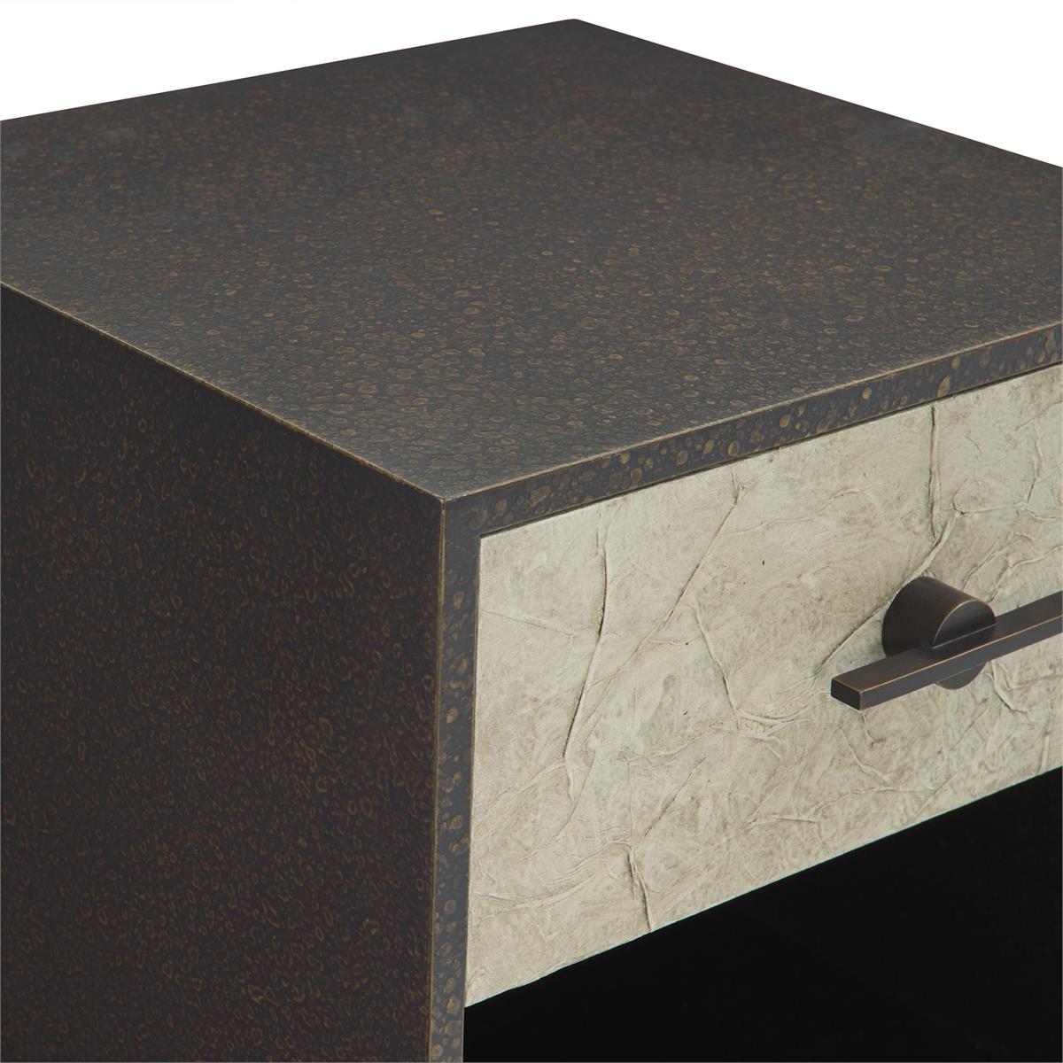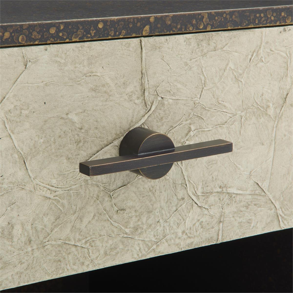 Product Description: John Richard EUR-01-0499 Nouvelle Two Drawer Nightstand Small - The Nouvelle Drawer is a stunning blend of refined tones and rich textures that greatly elevates an interior space. A wooden frame sitting atop two slender legs is adorned in a bronzed finish, playfully contrasted by ivory-hued rice paper stretched across the facade. Two drawers separated by open shelving feature long steel handles, matching the frame to complete the look.