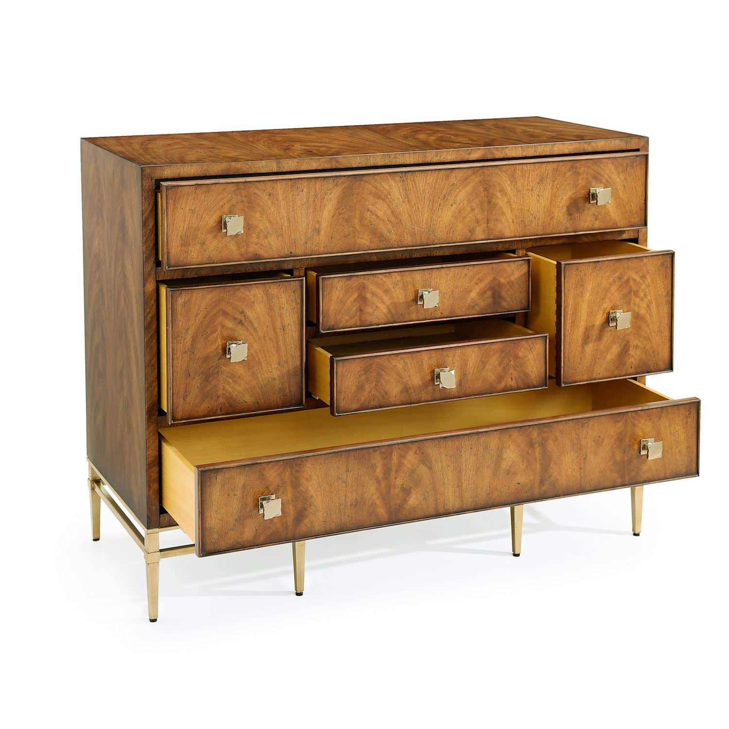 Product Description: John Richard EUR-01-0538 Marlowe Six Drawer Chest - The Marlowe Six-Drawer Chest is a gorgeous design statement with a sophisticated presence. Crafted from cerejeira wood in a Walnut finish, the piece displays a stately look elevated by flowing grain patterns. Each of the six soft-close drawers feature sculptural molding and abstractly shaped stainless-steel handles in White Brass, matching the slender steel base below.