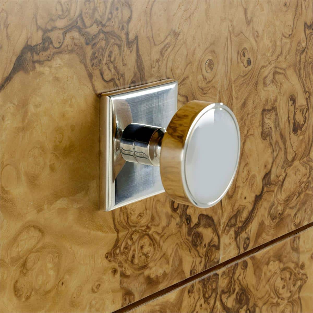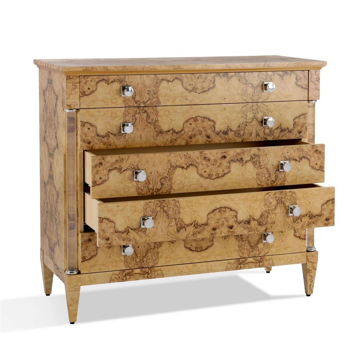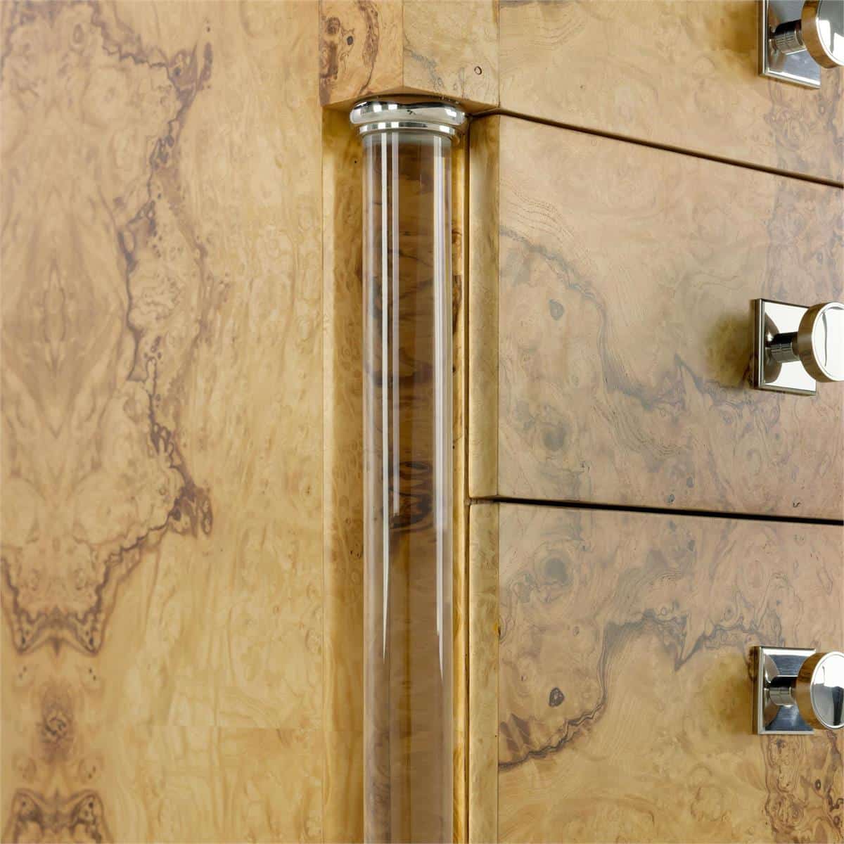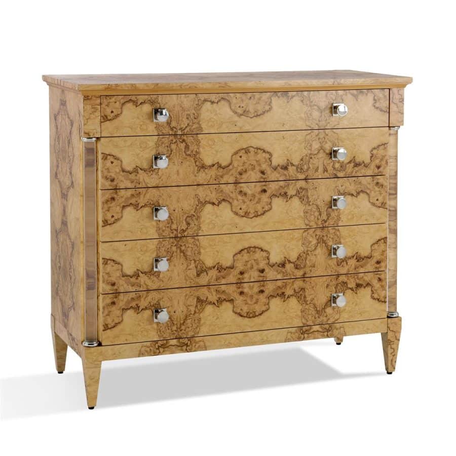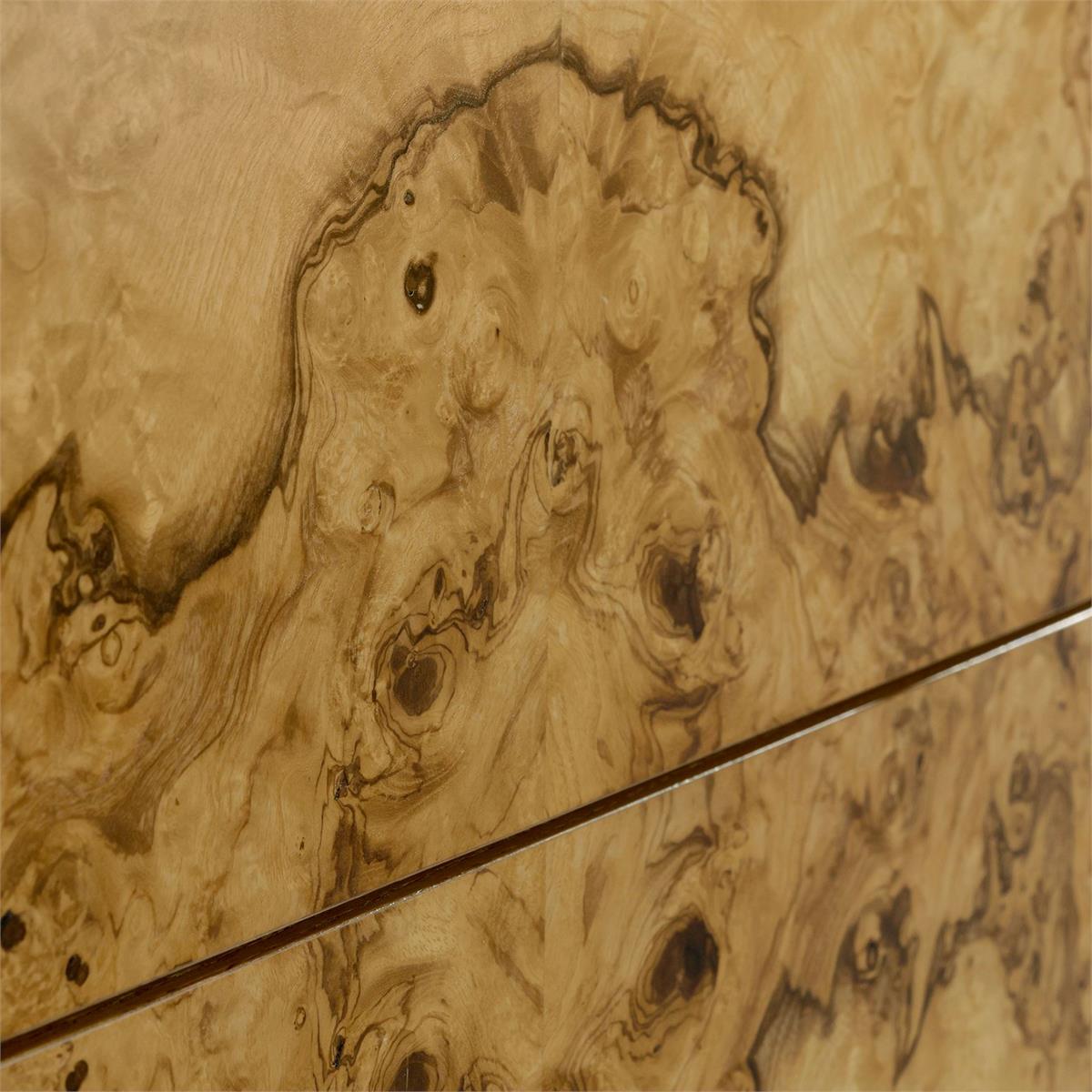 Product Description: John Richard EUR-01-0542 Olea Five-Drawer Chest - The Olea Five-Drawer Chest showcases the striking beauty of ash burl, finished in Natural Olive Ash to emphasize its unique grain patterns. The bold, organic swirls of the burl are beautifully contrasted with the chest's refined silhouette and sculptural legs. Two acrylic columns border the five drawers, contributing a modern touch that complements the Polished Stainless Steel handles.