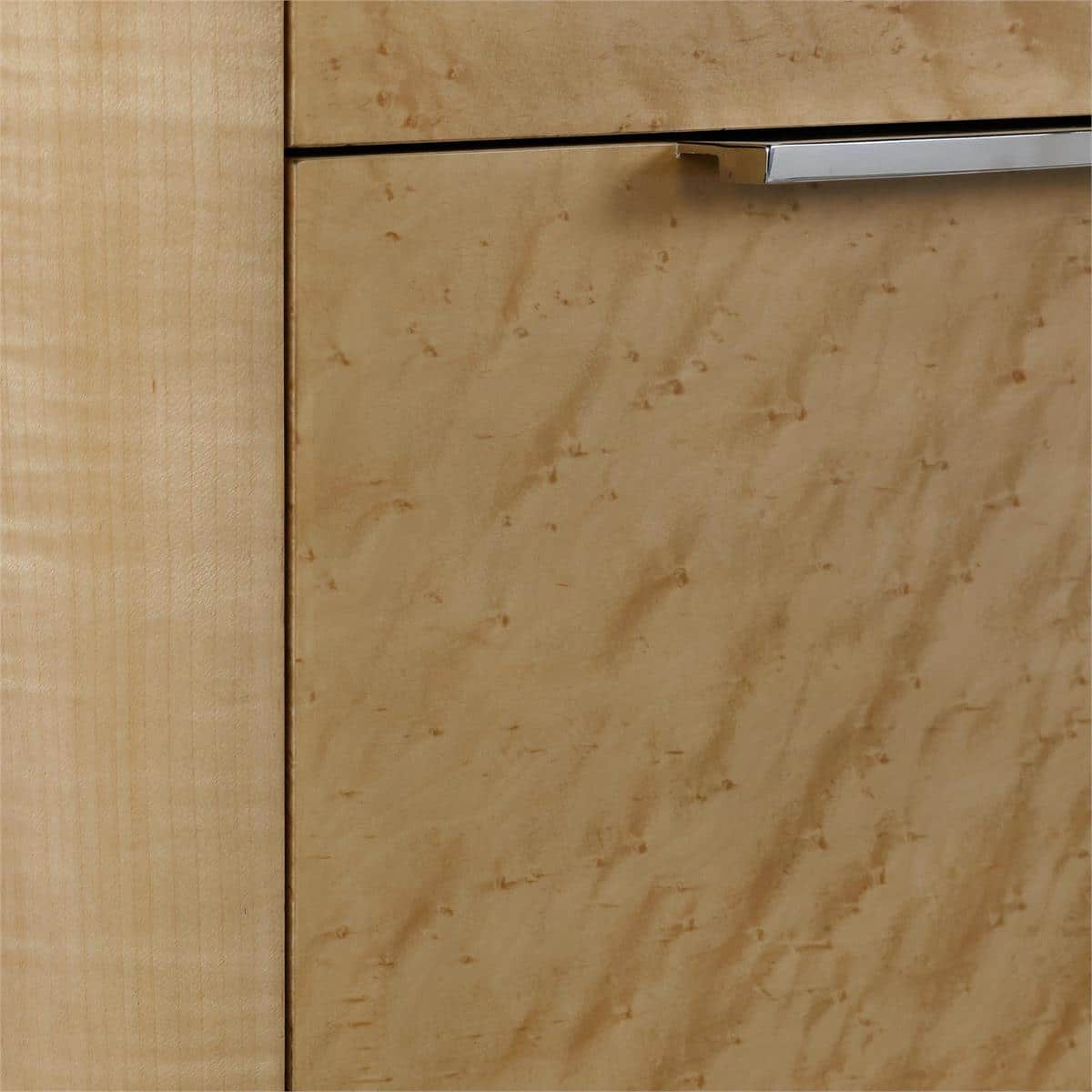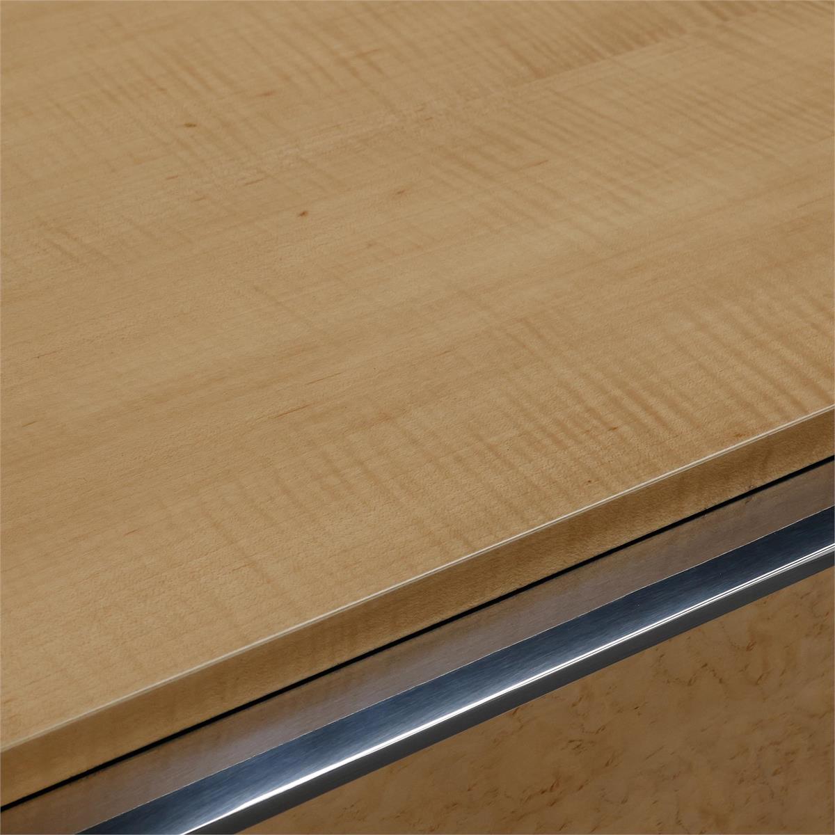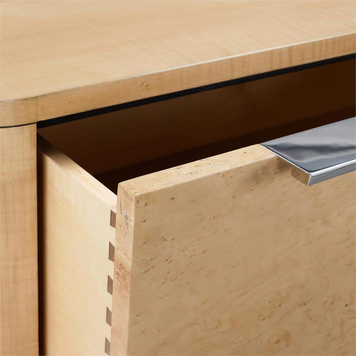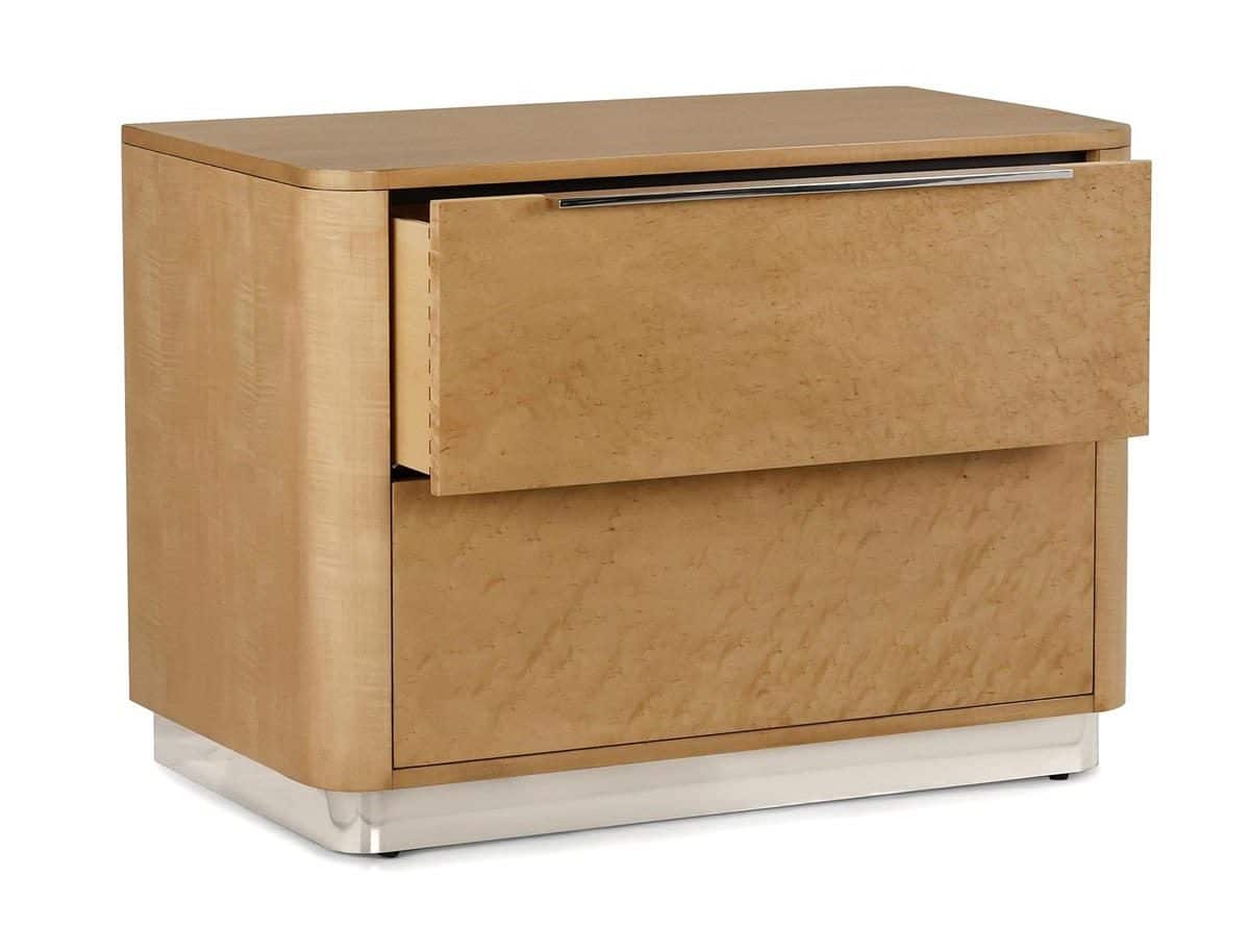 Product Description: John Richard EUR-01-0547 Doncaster Two-Drawer Chest - The Doncaster Two-Drawer Chest showcases figured maple veneer in a rich Butterscotch finish, emphasizing the natural depth and luster of the wood. Across the two drawers, Bird’s Eye maple veneer playfully contrasts the surrounding grain, introducing movement and visual intrigue. A polished stainless steel base and coordinating handles provide a sleek counterpoint to the warm finish. The piece is fitted with adjustable glides for effortless placement.