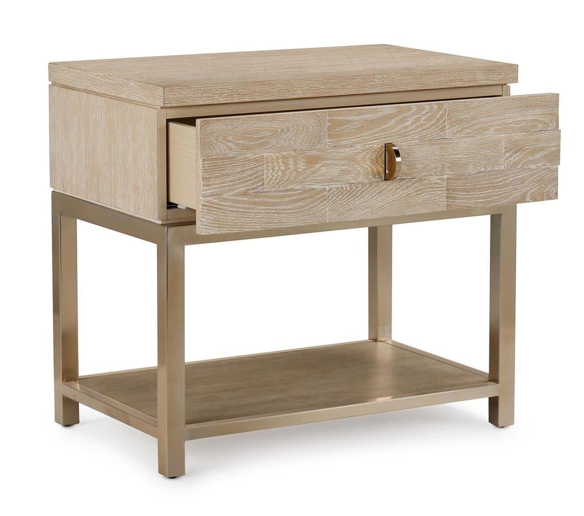 Product Description: John Richard EUR-01-0557 Verity Nightstand - The Verity Nightstand is a stylish contemporary design crafted from oak wood in a Limed Oak finish. Showcasing a delightful cream tone, the chest’s timeless silhouette is elevated by subtly arched patterns across the drawer. A polished stainless steel base with open storage showcases White Brass tones, matched by the rounded handle to complete the look.