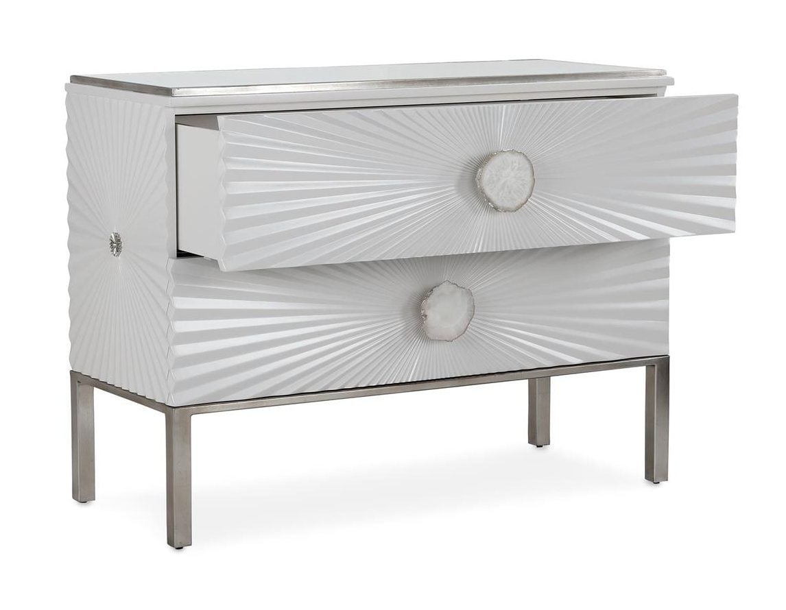 Product Description: John Richard EUR-01-0564 Contarini Two-Drawer Chest - The Contarini Two-Drawer Chest presents a refined study in texture and contrast. Crafted from beech wood, the piece features dimensional composite décor in a Palazzo finish that radiates outward across the front and sides in sculptural precision. A glass tabletop with clean églomisé introduces a luminous clarity that complements the chest’s sleek, contemporary form. The design is elevated by a Silver Steel finish outlining the edges of the wood top, the steel base, and the natural agate handles.