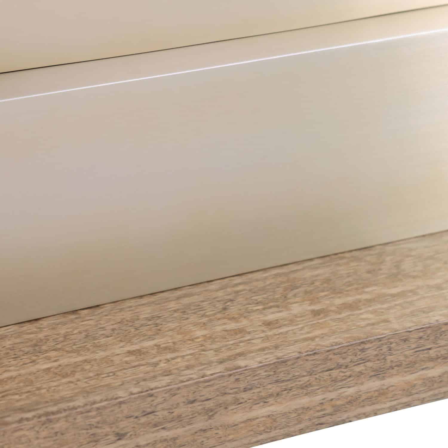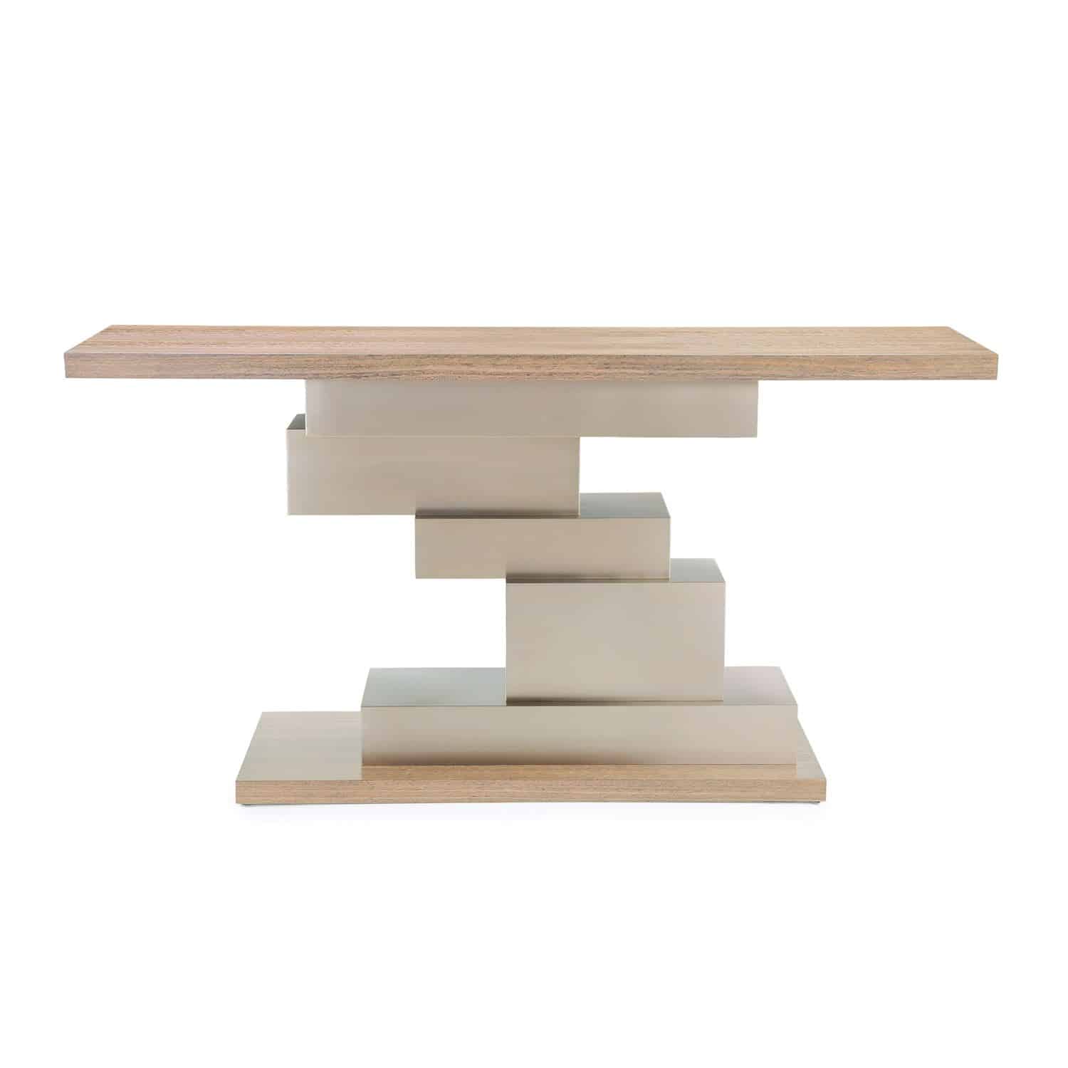 Product Description: John Richard EUR-02-0385 Shift Console Table - The Shift Console Table features a striking modern design that creates a stunning focal point in any interior. Crafted from eucalyptus wood in a Tristan finish, the tabletop and matching base showcase gorgeous natural hues. A unique body of brushed stainless steel presents an offset stack of rectangles in varying sizes, adorned in a White Brass finish that offers a graceful contrast to the surrounding browns.