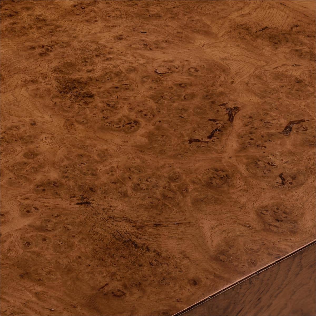Product Description: John Richard EUR-02-0408 Antigo Console Table - The Antigo Console Table showcases oak burl cluster veneer in a Fruitwood finish that flows seamlessly from the top into the legs, its swirling grain introducing warmth and organic movement. The apron and lower shelf feature quarter oak veneer in a Red Oak finish, creating a refined contrast through their distinctive grain patterns. These natural tones and textures provide a bold counterpoint to the table’s clean, architectural profile. The piece is fitted with adjustable glides for effortless placement.