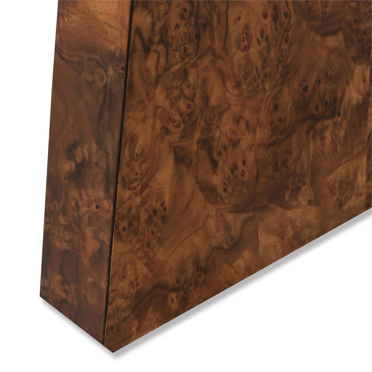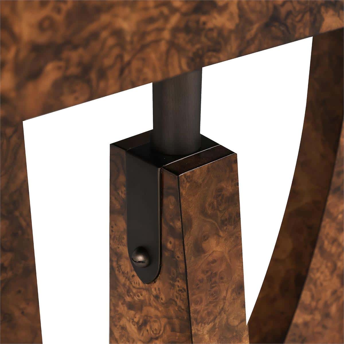 Product Description: John Richard EUR-02-0413 Parabola Console Table - The Parabola Console Table is a study in balance between organic texture and sculptural form. Its frame and top are crafted from American Black Walnut burl veneer in a Bleached Walnut finish, the natural whorls and mottled patterns of the burl creating a surface alive with quiet movement. Beneath, steel supports in an Indo Bronze finish rise from the curved walnut legs, intersecting the form with clean precision. The piece is fitted with adjustable glides for effortless placement.