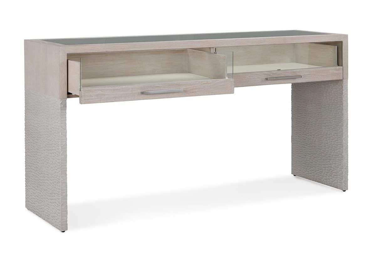 Product Description: John Richard EUR-02-0414 Galicia Two-Drawer Lighted Console Table - The Galicia Two-Drawer Lighted Console Table offers a refined balance of tone and texture. Crafted from oak in a Grey Washed finish, the design presents a cohesive look inside and out. The flowing, organic motifs of the composite detailing in Acropolis Grey defines the legs with subtle dimension, while a tempered glass tabletop lends a light, airy presence. Suede-lined drawers accented by Polished Stainless Steel handles open to reveal interior LED lighting that illuminates the space within. The piece is fitted with adjustable glides for effortless placement.