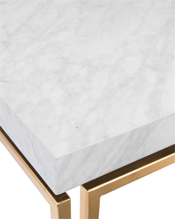 Product Description: John Richard EUR-03-0647 Calabria Cocktail Table - The Carrara marble top of this cocktail table is supported by a steel base finished in gold. The base features double legs strapped together with ties, which are repeated underneath the top.