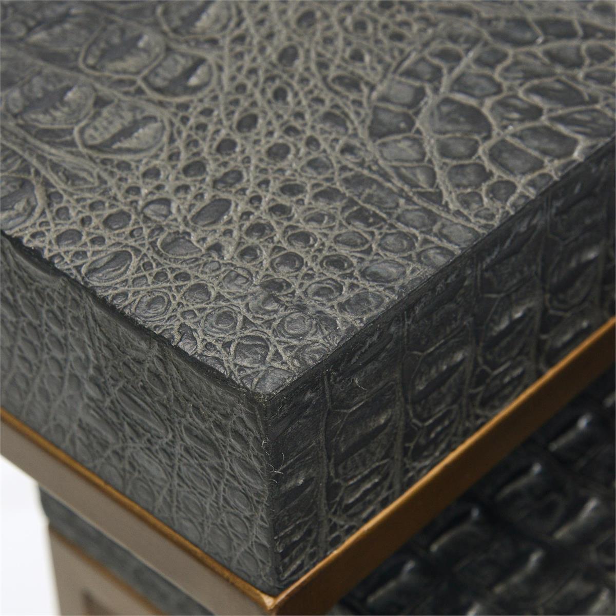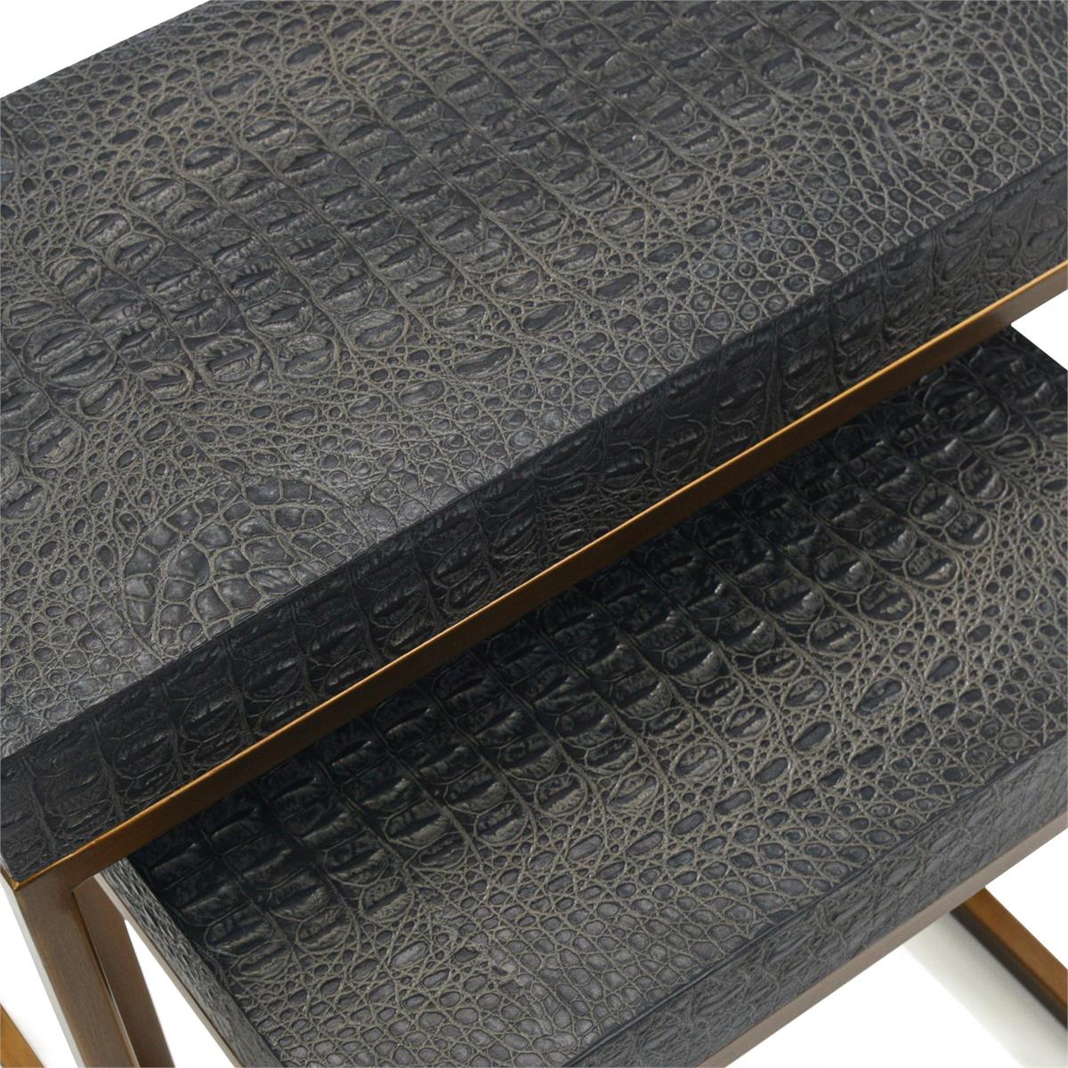 Product Description: John Richard EUR-03-0823S2 Greystoke Nesting End Tables - This set of two nesting end tables feature tops with faux crocodile hide in greystoke black and metal bases in an Aztec gold finish.