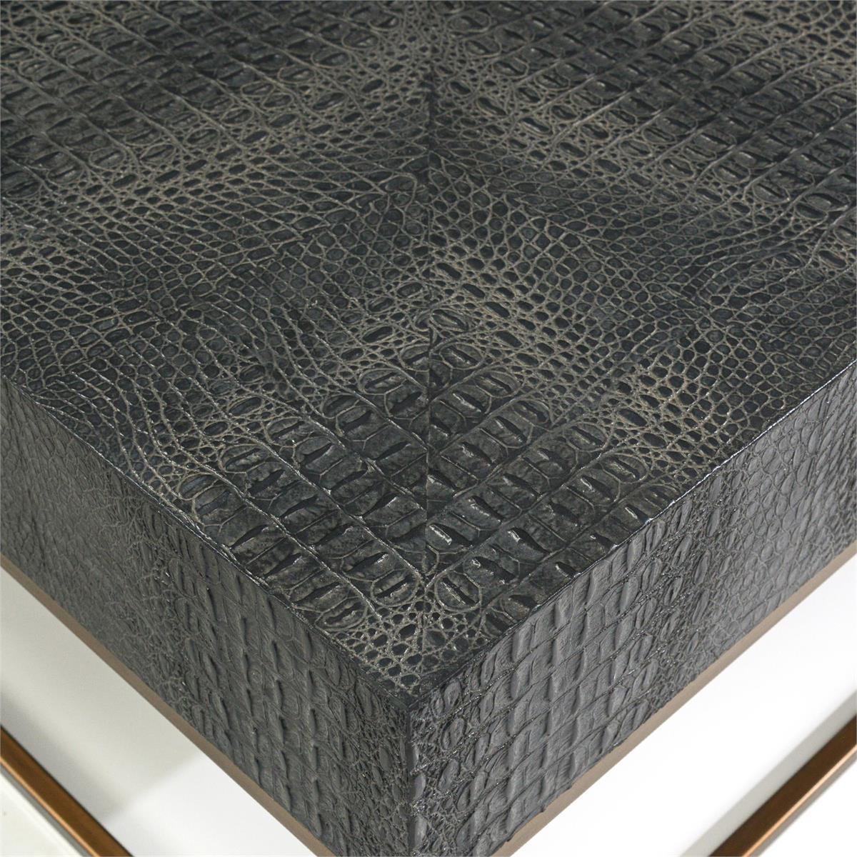 Product Description: John Richard EUR-03-0826 Greystoke Cocktail Table - Greystoke Cocktail Table features a top with faux crocodile hide in greystoke black and metal base in an Aztec gold finish.