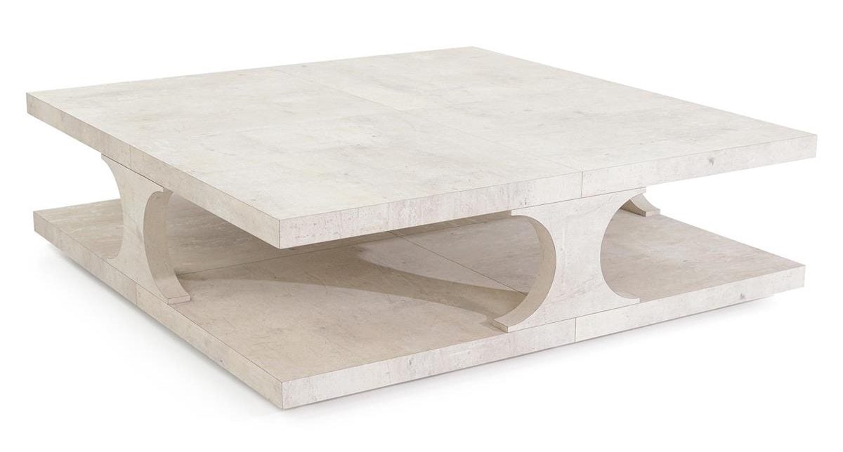 Product Description: John Richard EUR-03-0878 Cadence Cocktail Table - The Cadence Cocktail Table exhibits a sophisticated, refined look that imbues an interior space with a dignified aura. Crafted from beech wood, the piece features a Tiza Gesso finish for a gorgeous textural look. Open-air storage between the tabletop and base is created through curvaceous supports, resulting in playful juxtaposition between straight lines and rounded angles.