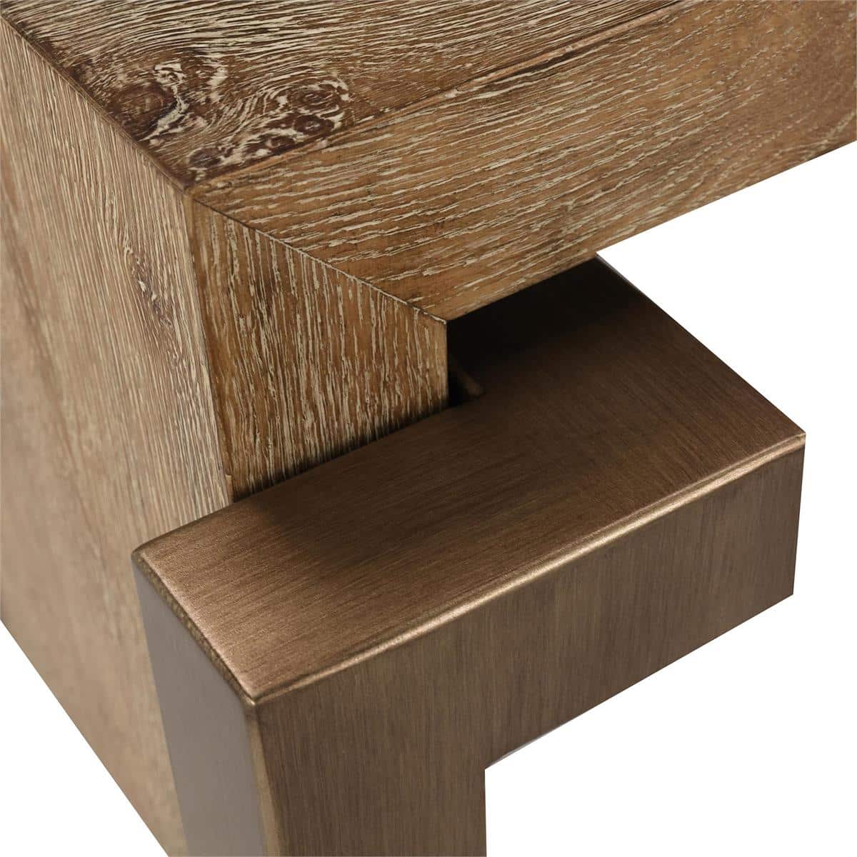 Product Description: John Richard EUR-03-0932 Dorado Cocktail Table - The Dorado Cocktail Table showcases rustic white oak veneer in a Lakeshore finish, its softly textured grain introducing gorgeous natural textures. A geometric steel base in Pale Bronze introduces gentle contrast, complementing the wood’s tone with a subtle metallic glow. Defined by clean lines and refined simplicity, the piece exudes contemporary charm in any setting. Each design is fitted with adjustable glides for effortless placement.