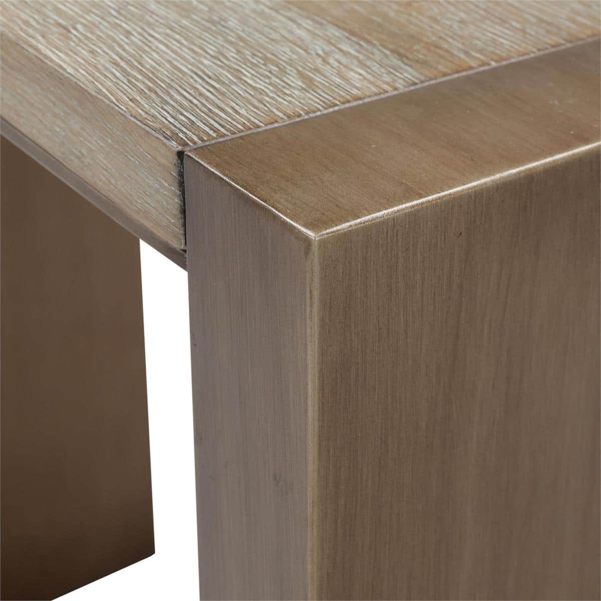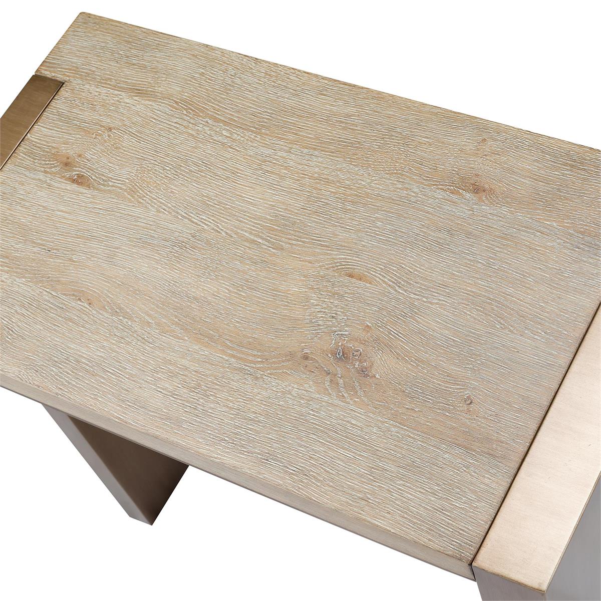 Product Description: John Richard EUR-03-0933 Dorado Accent Table - The Dorado Accent Table showcases rustic white oak veneer in a Lakeshore finish, its softly textured grain introducing gorgeous natural textures. A stylish steel base in Pale Bronze introduces gentle contrast, complementing the wood’s tone with a subtle metallic glow. Defined by clean lines and refined simplicity, the piece exudes contemporary charm in any setting. Each design is fitted with adjustable glides for effortless placement.