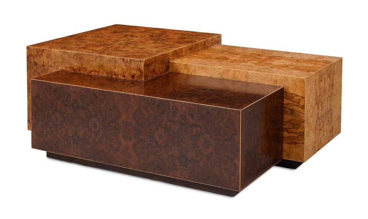 Product Description: John Richard EUR-03-0956 Alber Cocktail Table - The Alber Cocktail Table features a stylish Burly Blend finish, combining Mappa burl, olive ash burl, and American black walnut burl to showcase a range of distinct natural hues. Its geometric silhouette, traced with crisp clear coat mouldings, provides structure and balance to the intricate movement of the burl, achieving a sophisticated look rich with dimension. The piece is fitted with adjustable glides for effortless placement.