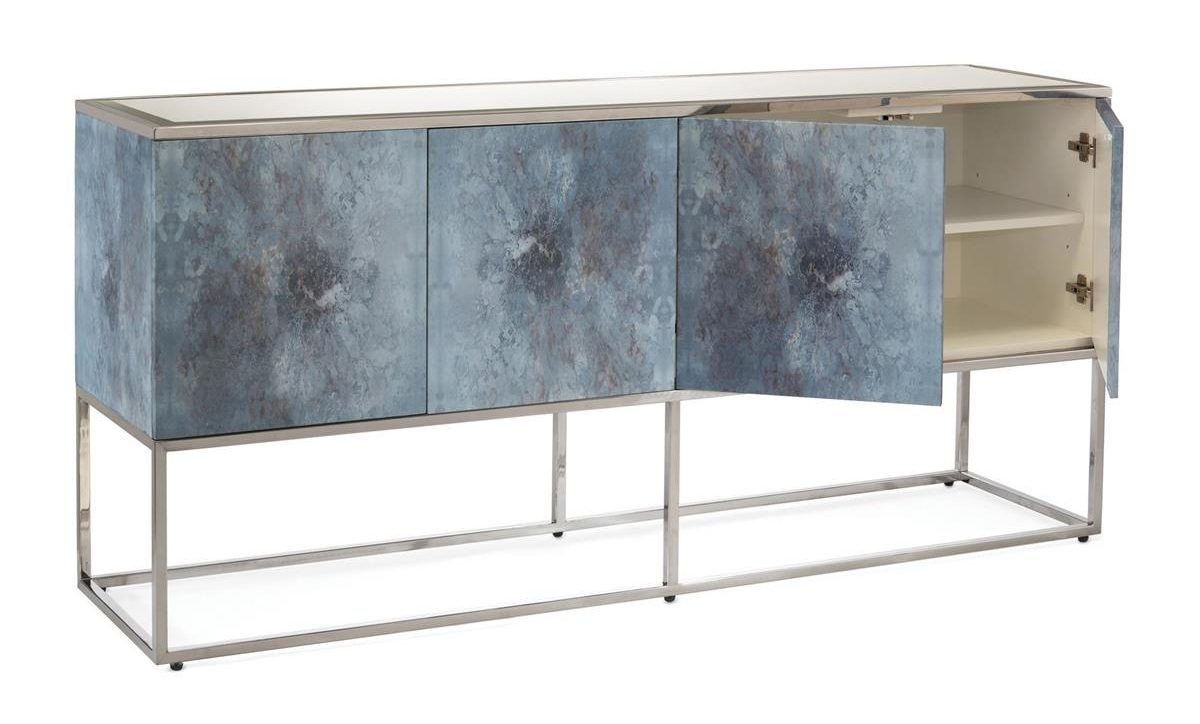 Product Description: John Richard EUR-04-0313 Clayton Four Door Cabinet - Adding art in an unexpected place gives us the Clayton Cabinet, which is in our beautiful giclée finish. It has a beveled mirror top and polished nickel base.