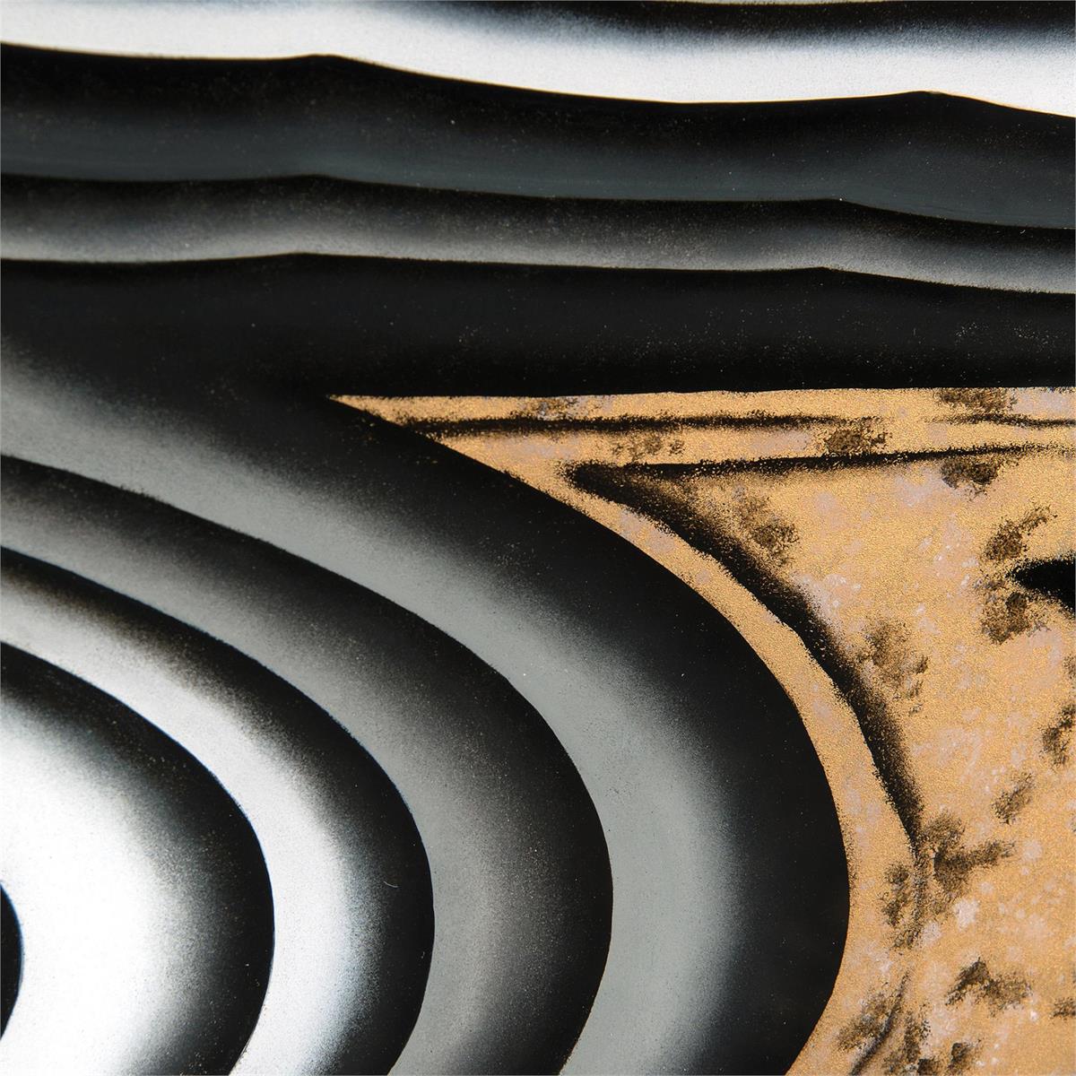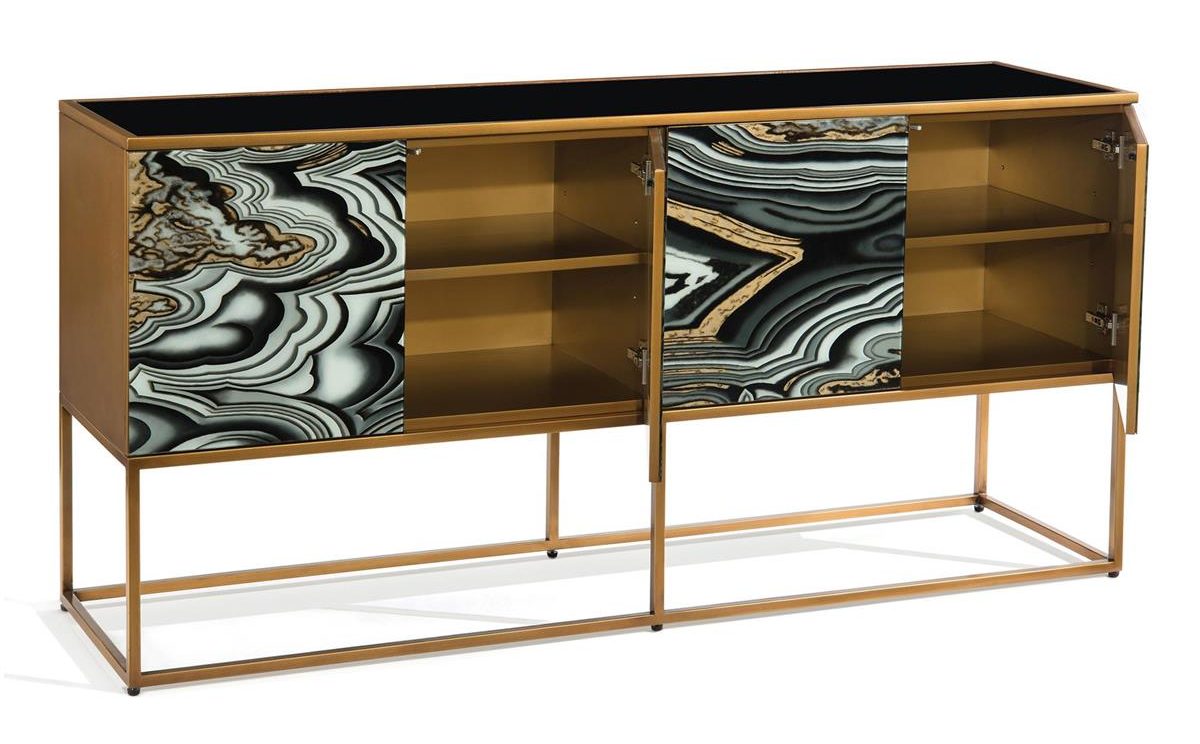 Product Description: John Richard EUR-04-0401 I Dream of Agate Four Door Cabinet - The agate design running across the front of the doors is reverse-hand-painted, above which is a black glass top inset in an Aztec gold frame. The base is also finished in Aztec gold.