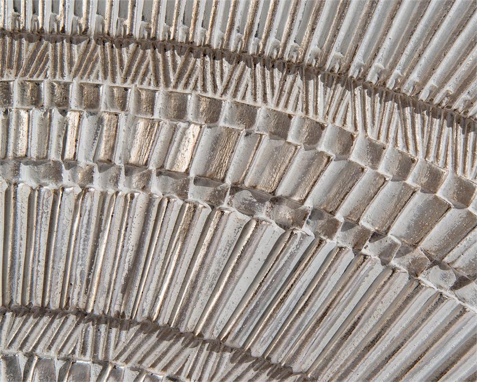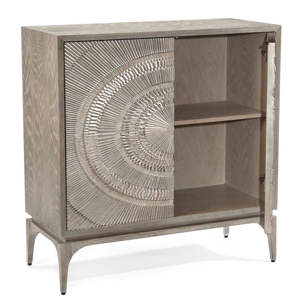 Product Description: John Richard EUR-04-0413 Cosmos Two Door Cabinet - The doors have a silver white, radiating pattern from the center, and they are set in a grey oak case.