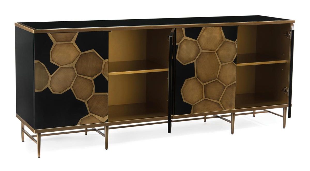 Product Description: John Richard EUR-04-0449 Honeycomb Credenza - The top and sides of this credenza have inset black glass panels with gold framing, while the doors, also in black glass, have a reverse-painted stylized honeycomb pattern using different shades of gold to add contrast and texture. The steel base is also finished in gold.