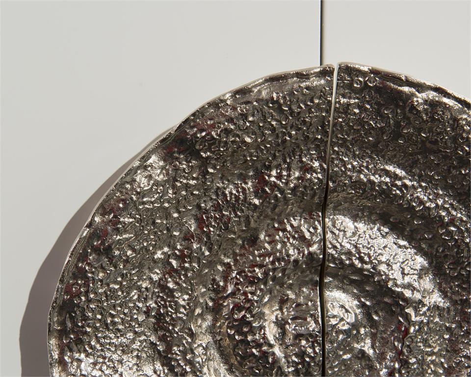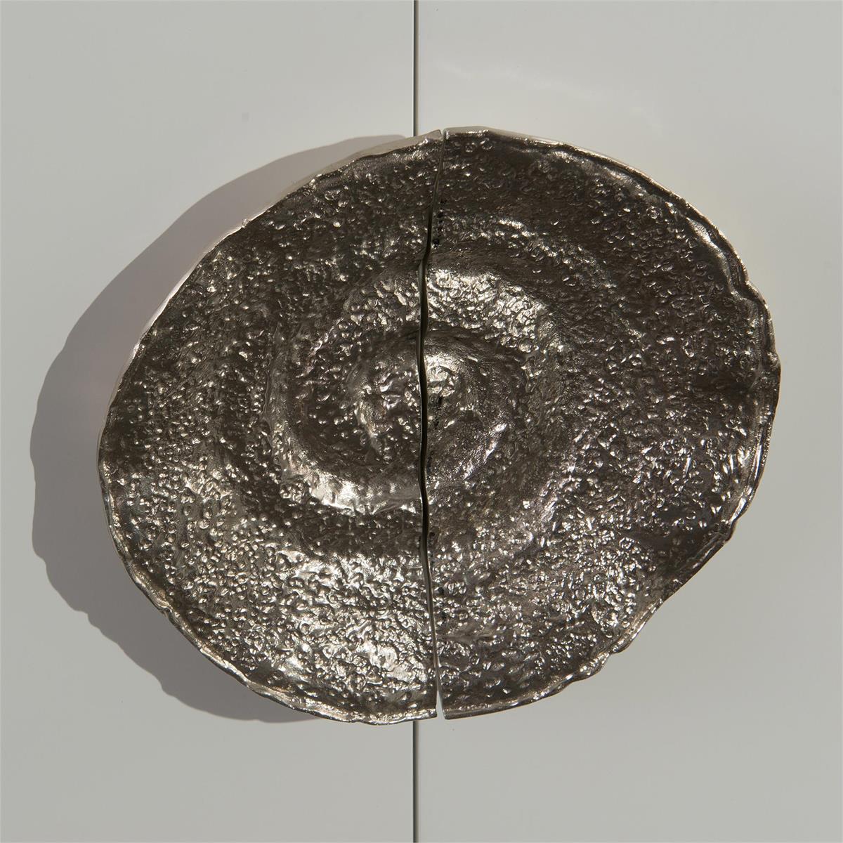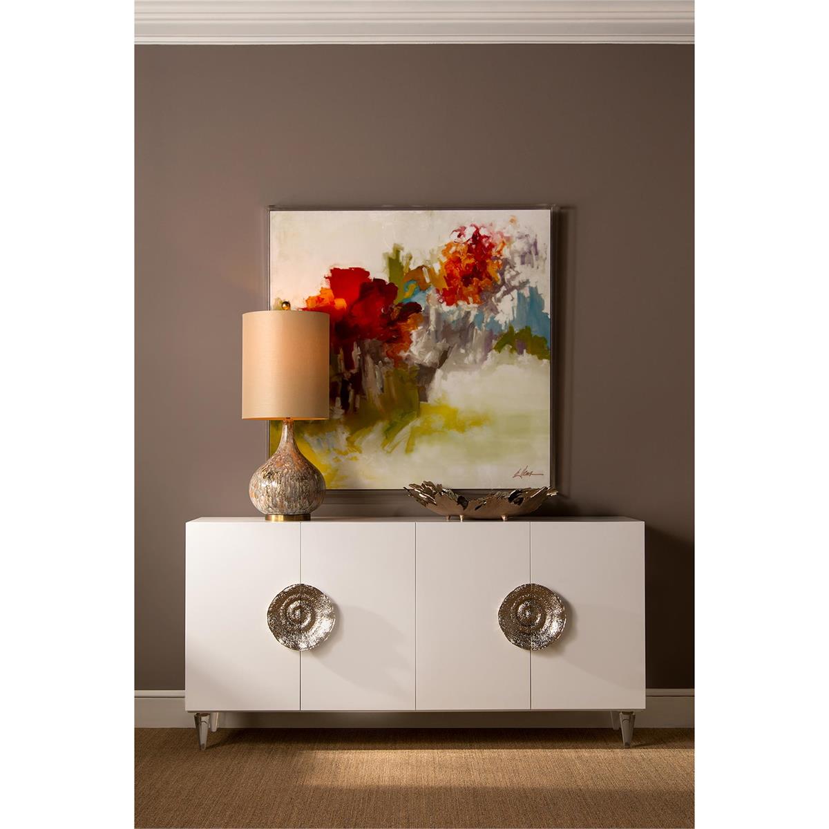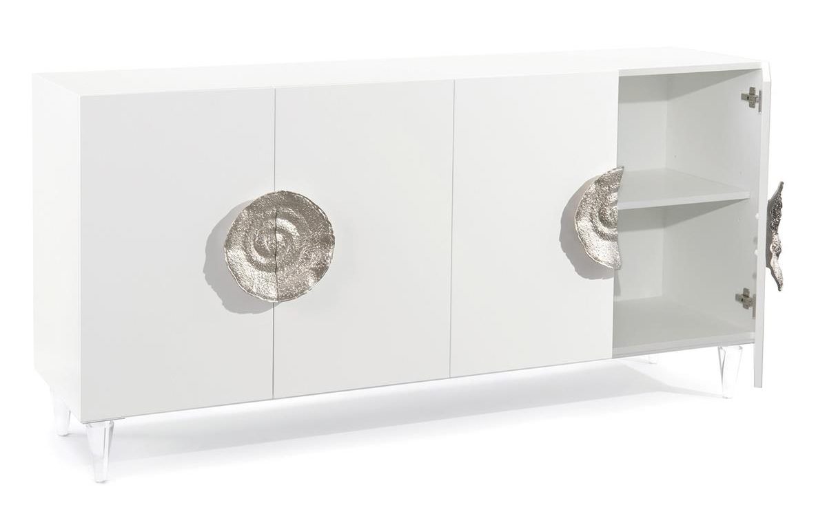 Product Description: John Richard EUR-04-0459 Triesse Four Door Credenza - Standing on turned acrylic legs and finished in ice white, this four-door credenza has bold, silvered escargot handles on each pair of doors.