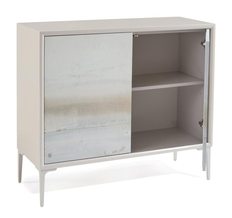 Product Description: John Richard EUR-04-0488 Austin A. James River Two Door Cabinet - This two-door cabinet in light gray features a giclée of Soft Blue River by Austin A. James across the doors, each with push-latch mechanisms. The metal legs are in a matching light gray finish.