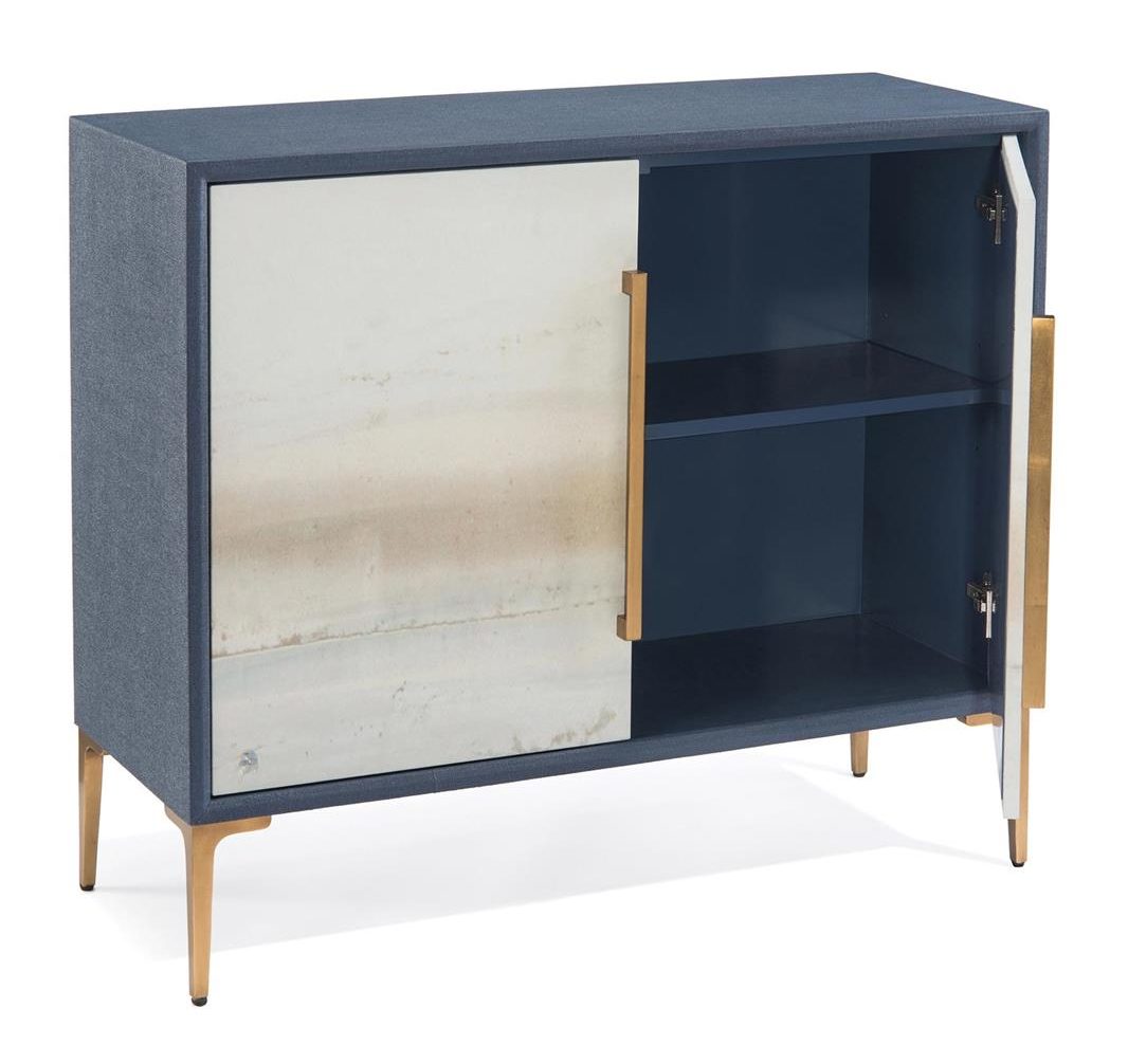 Product Description: John Richard EUR-04-0490 Austin A. James Brentwood Two Door Cabinet - This two-door cabinet is inlaid in linen and finished in indigo batik. A fragmented segment of Soft Blue River by Austin A. James covers the two doors, which are each fitted with soft-closing hinges and bar handles in a polished brass finish. The metal legs are in a gold-leaf finish.